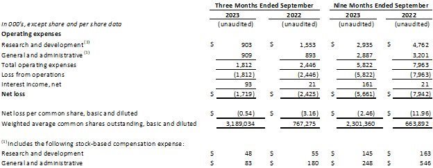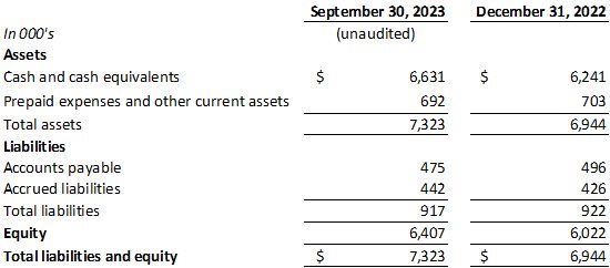 As of September 30, 2023, the Company had approximately $6.6 million in cash and cash equivalents, compared to $6.2 million as of December 31, 2022. The increase in cash and cash equivalents resulted from $5.7 million net proceeds from the financings that closed in March 2023 and May 2023, offset by $5.3 million of cash used in operations for the nine months ended September 30, 2023. The Company expects its current cash resources are sufficient to fund operations into the second quarter of 2024.