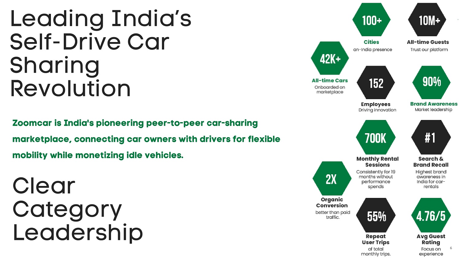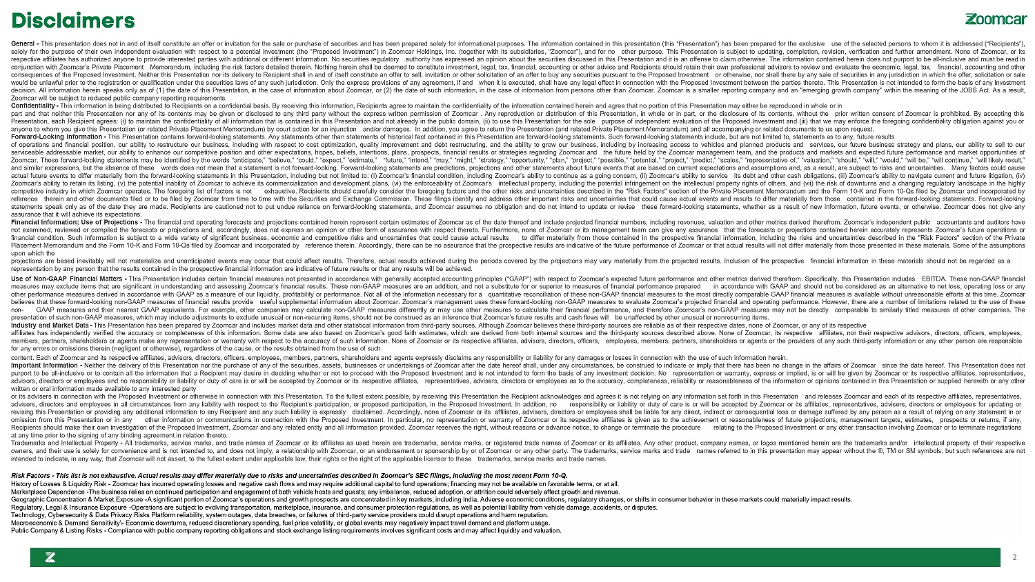 General - This presentation does not in and of itself constitute an offer or invitation for the sale or purchase of securities and has been prepared solely for informational purposes . The information contained in this presentation (this “Presentation”) has been prepared for the exclusive use of the selected persons to whom it is addressed (“Recipients”), solely for the purpose of their own independent evaluation with respect to a potential investment (the “Proposed Investment”) in Zoomcar Holdings, Inc . (together with its subsidiaries, “Zoomcar”), and for no other purpose . This Presentation is subject to updating, completion, revision, verification and further amendment . None of Zoomcar, or its respective affiliates has authorized anyone to provide interested parties with additional or different information . No securities regulatory authority has expressed an opinion about the securities discussed in this Presentation and it is an offense to claim otherwise . The information contained herein does not purport to be all - inclusive and must be read in conjunction with Zoomcar’s Private Placement Memorandum, including the risk factors detailed therein . Nothing herein shall be deemed to constitute investment, legal, tax, financial, accounting or other advice and Recipients should retain their own professional advisors to review and evaluate the economic, legal, tax, financial, accounting and other consequences of the Proposed Investment . Neither this Presentation nor its delivery to Recipient shall in and of itself constitute an offer to sell, invitation or other solicitation of an offer to buy any securities pursuant to the Proposed Investment or otherwise, nor shall there by any sale of securities in any jurisdiction in which the offer, solicitation or sale would be unlawful prior to the registration or qualification under the securities laws of any such jurisdiction . Only the express provisions of any agreement, if and when it is executed, shall have any legal effect in connection with the Proposed Investment between the parties thereto . This Presentation is not intended to form the basis of any investment decision . All information herein speaks only as of ( 1 ) the date of this Presentation, in the case of information about Zoomcar, or ( 2 ) the date of such information, in the case of information from persons other than Zoomcar . Zoomcar is a smaller reporting company and an "emerging growth company" within the meaning of the JOBS Act . As a result, Zoomcar will be subject to reduced public company reporting requirements . Confidentiality - This information is being distributed to Recipients on a confidential basis . By receiving this information, Recipients agree to maintain the confidentiality of the information contained herein and agree that no portion of this Presentation may either be reproduced in whole or in part and that neither this Presentation nor any of its contents may be given or disclosed to any third party without the express written permission of Zoomcar . Any reproduction or distribution of this Presentation, in whole or in part, or the disclosure of its contents, without the prior written consent of Zoomcar is prohibited . By accepting this Presentation, each Recipient agrees : (i) to maintain the confidentiality of all information that is contained in this Presentation and not already in the public domain, (ii) to use this Presentation for the sole purpose of independent evaluation of the Proposed Investment and (iii) that we may enforce the foregoing confidentiality obligation against you or anyone to whom you give this Presentation (or related Private Placement Memorandum) by court action for an injunction and/or damages . In addition, you agree to return the Presentation (and related Private Placement Memorandum) and all accompanying or related documents to us upon request . Forward - Looking Information - This Presentation contains forward - looking statements . Any statements other than statements of historical fact contained in this Presentation are forward - looking statements . Such forward - looking statements include, but are not limited to, statements as to any, future results of operations and financial position, our ability to restructure our business, including with respect to cost optimization, quality improvement and debt restructuring, and the ability to grow our business, including by increasing access to vehicles and planned products and services, our future business strategy and plans, our ability to sell to our serviceable addressable market, our ability to enhance our competitive position and other expectations, hopes, beliefs, intentions, plans, prospects, financial results or strategies regarding Zoomcar and the future held by the Zoomcar management team, and the products and markets and expected future performance and market opportunities of Zoomcar . These forward - looking statements may be identified by the words “anticipate,” “believe,” “could,” “expect,” “estimate,” “future,” “intend,” “may,” “might,” “strategy,” “opportunity,” “plan,” “project,” “possible,” “potential,” “project,” “predict,” “scales,” “representative of,” “valuation,” “should,” “will,” “would,” “will be,” “will continue,” “will likely result,” and similar expressions, but the absence of these words does not mean that a statement is not forward - looking . Forward - looking statements are predictions, projections and other statements about future events that are based on current expectations and assumptions and, as a result, are subject to risks and uncertainties . Many factors could cause actual future events to differ materially from the forward - looking statements in this Presentation, including but not limited to : (i) Zoomcar’s financial condition, including Zoomcar’s ability to continue as a going concern, (ii) Zoomcar’s abilit