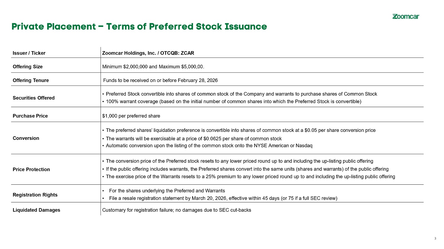 Zoomcar Holdings, Inc. / OTCQB: ZCAR Issuer / Ticker Minimum $2,000,000 and Maximum $5,000,00. Offering Size Funds to be received on or before February 28, 2026 Offering Tenure • Preferred Stock convertible into shares of common stock of the Company and warrants to purchase shares of Common Stock • 100% warrant coverage (based on the initial number of common shares into which the Preferred Stock is convertible) Securities Offered $1,000 per preferred share Purchase Price • The preferred shares’ liquidation preference is convertible into shares of common stock at a $0.05 per share conversion price • The warrants will be exercisable at a price of $0.0625 per share of common stock • Automatic conversion upon the listing of the common stock onto the NYSE American or Nasdaq Conversion • The conversion price of the Preferred stock resets to any lower priced round up to and including the up - listing public offering • If the public offering includes warrants, the Preferred shares convert into the same units (shares and warrants) of the public offering • The exercise price of the Warrants resets to a 25% premium to any lower priced round up to and including the up - listing public offering Price Protection • For the shares underlying the Preferred and Warrants • File a resale registration statement by March 20, 2026, effective within 45 days (or 75 if a full SEC review) Registration Rights Customary for registration failure; no damages due to SEC cut - backs Liquidated Damages 3