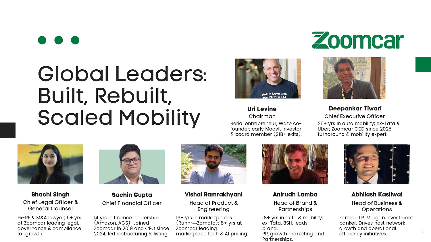 Serial entrepreneur, Waze co - founder ; early Moovit investor & board member ( $ 1 B+ exits) . 25+ yrs in auto mobility; ex - Tata & Uber; Zoomcar CEO since 2025, turnaround & mobility expert. Ex - PE & M&A lawyer; 6+ yrs at Zoomcar leading legal, governance & compliance for growth. 14 yrs in finance leadership (Amazon, AGS); Joined Zoomcar in 2019 and CFO since 2024, led restructuring & listing. 13+ yrs in marketplaces (Runnr → Zomato); 8+ yrs at Zoomcar leading marketplace tech & AI pricing. 18+ yrs in auto & mobility; ex - Tata, BSH, leads brand, PR, growth marketing and Partnerships. Former J.P. Morgan investment banker. Drives host network growth and operational efficiency initiatives. 4