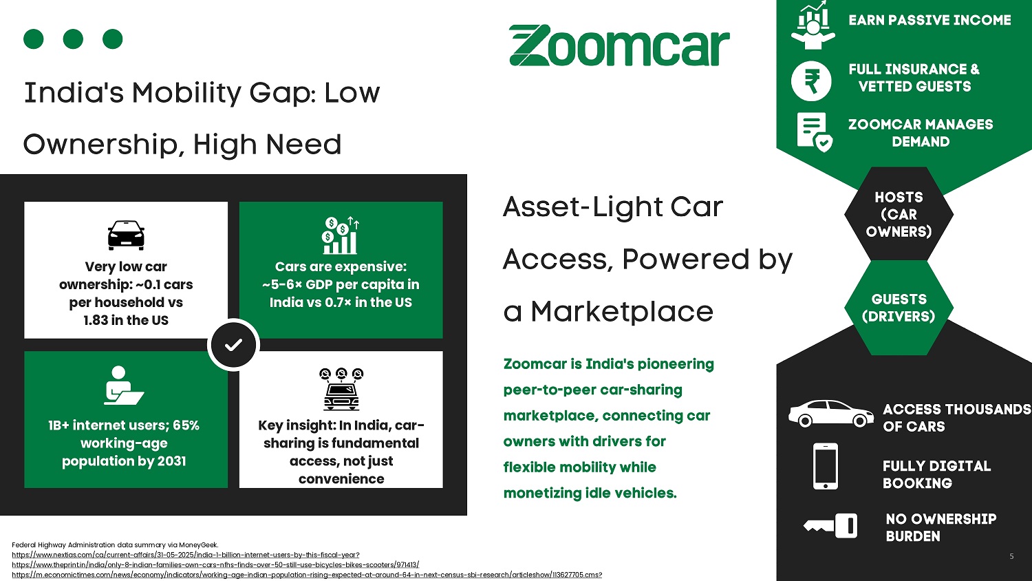 Very low car ownership: ~0.1 cars per household vs 1.83 in the US Key insight: In India, car - sharing is fundamental access, not just convenience Cars are expensive: ~5 - 6 ð GDP per capita in India vs 0.7 ð in the US 1B+ internet users; 65% working - age population by 2031 Federal Highway Administration data summary via MoneyGeek. https:// www.nextias.com/ca/current - affairs/31 - 05 - 2025/india - 1 - billion - internet - users - by - this - fiscal - year? https:// www.theprint.in/india/only - 8 - indian - families - own - cars - nfhs - finds - over - 50 - still - use - bicycles - bikes - scooters/971413/ https://m.economictimes.com/news/economy/indicators/working - age - indian - population - rising - expected - at - around - 64 - in - next - census - sbi - research/articleshow/113627705.cms? 5