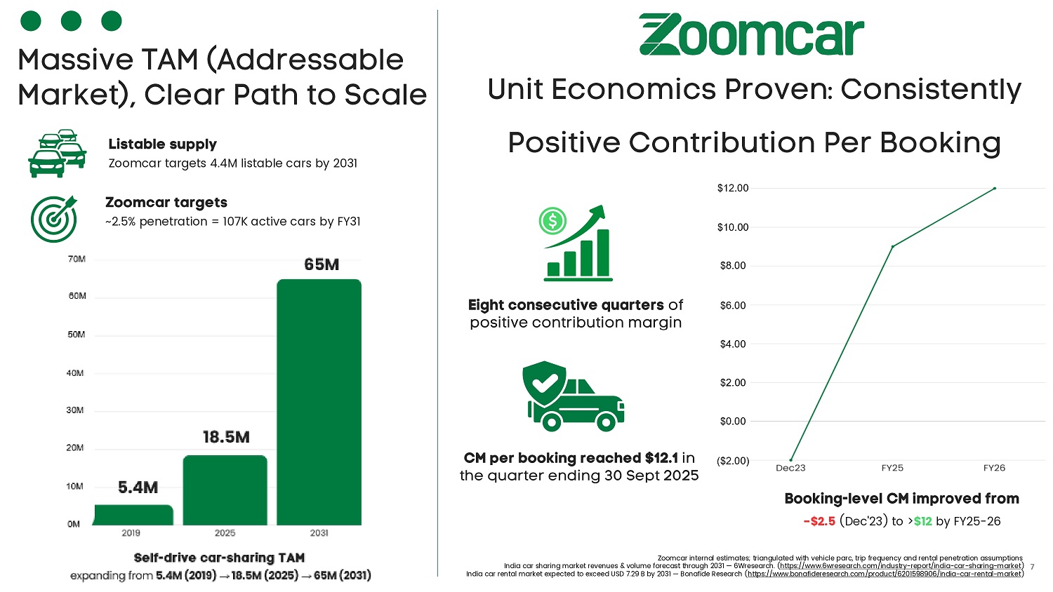 Zoomcar targets 4.4M listable cars by 2031 Zoomcar internal estimates; triangulated with vehicle parc, trip frequency and rental penetration assumptions India car sharing market revenues & volume forecast through 2031 — 6Wresearch. ( https://www.6wresearch.com/industry - report/india - car - sharing - market ) India car rental market expected to exceed USD 7.29 B by 2031 — Bonafide Research ( https://www.bonafideresearch.com/product/6201598906/india - car - renta l - market ) 7 $ $12.00 $ 1 $ 0.00 $ 8 $ . 00 $ 6 $ . 00 $ 4 $ . 00 $2.00 $ $0.00 $ ($2.00) - $2.5 (Dec'23) to > $12 by FY25 - 26 ~2.5% penetration = 107K active cars by FY31