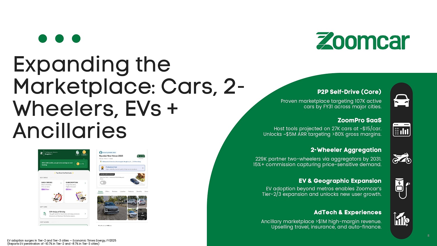 Proven marketplace targeting 107K active cars by FY31 across major cities. Host tools projected on 27K cars at ~$15/car. Unlocks ~$5M ARR targeting >80% gross margins. 229K partner two - wheelers via aggregators by 2031. 15%+ commission capturing price - sensitive demand. EV adoption beyond metros enables Zoomcar’s Tier - 2/3 expansion and unlocks new user growth. Ancillary marketplace >$1M high - margin revenue. Upselling travel, insurance, and auto - finance. EV adoption surges in Tier - 2 and Tier - 3 cities — Economic Times Energy, FY2025 (Reports EV penetration of ~10.7% in Tier - 2 and ~8.7% in Tier - 3 cities) 8