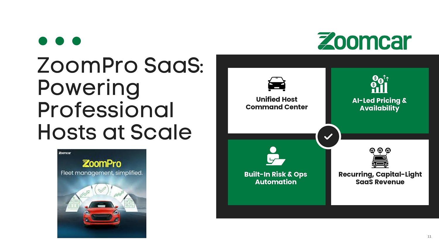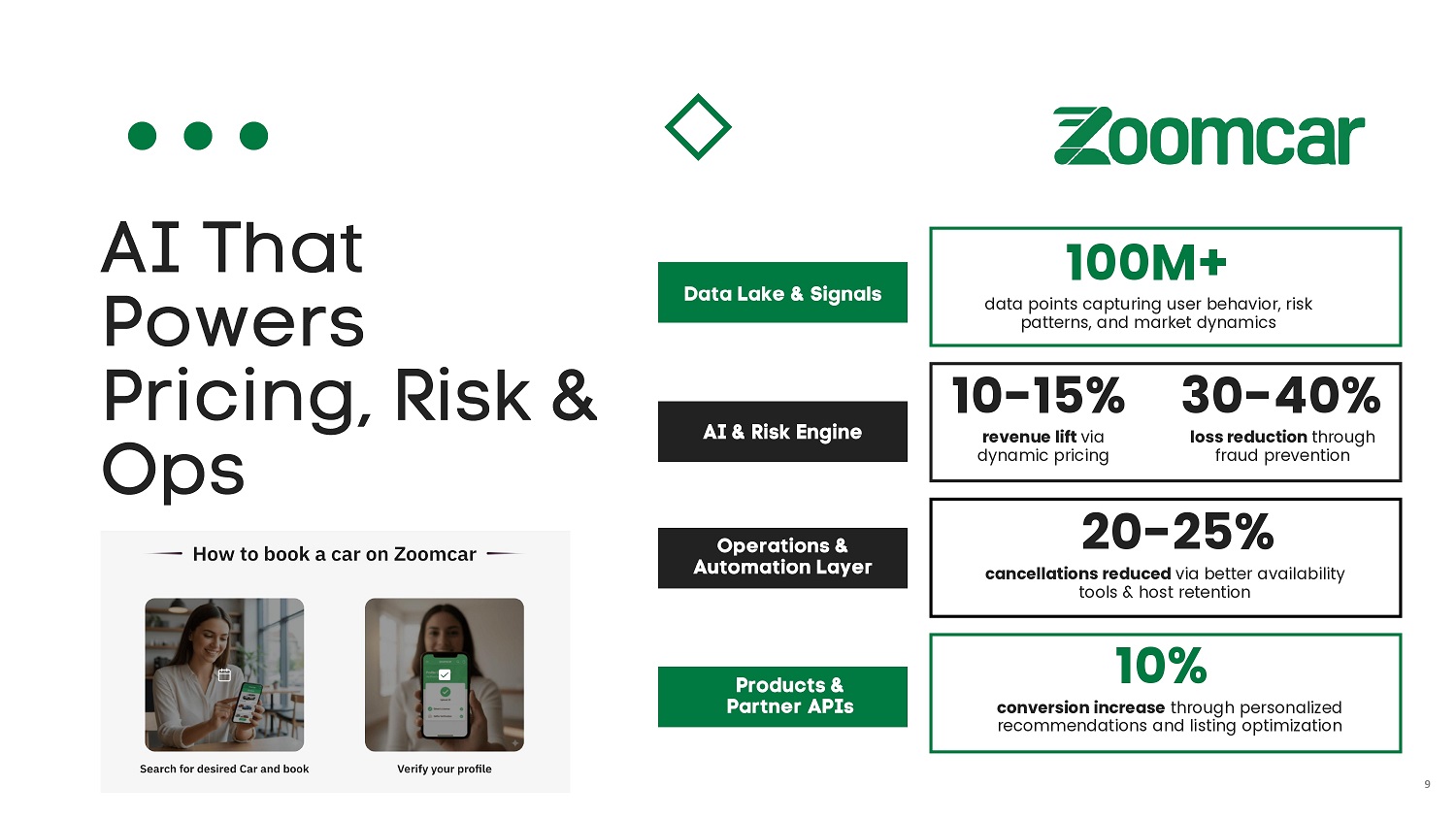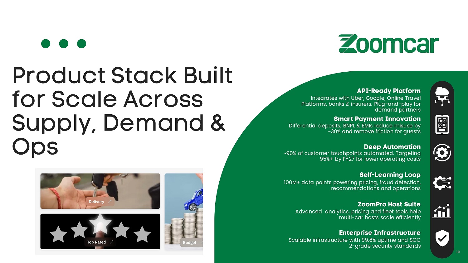 Integrates with Uber, Google, Online Travel Platforms, banks & insurers. Plug - and - play for demand partners Differential deposits, BNPL & EMIs reduce misuse by ~30% and remove friction for guests ~90% of customer touchpoints automated. Targeting 95%+ by FY27 for lower operating costs 100M+ data points powering pricing, fraud detection, recommendations and operations 10 Advanced analytics, pricing and fleet tools help multi - car hosts scale efficiently Scalable infrastructure with 99.8% uptime and SOC 2 - grade security standards
