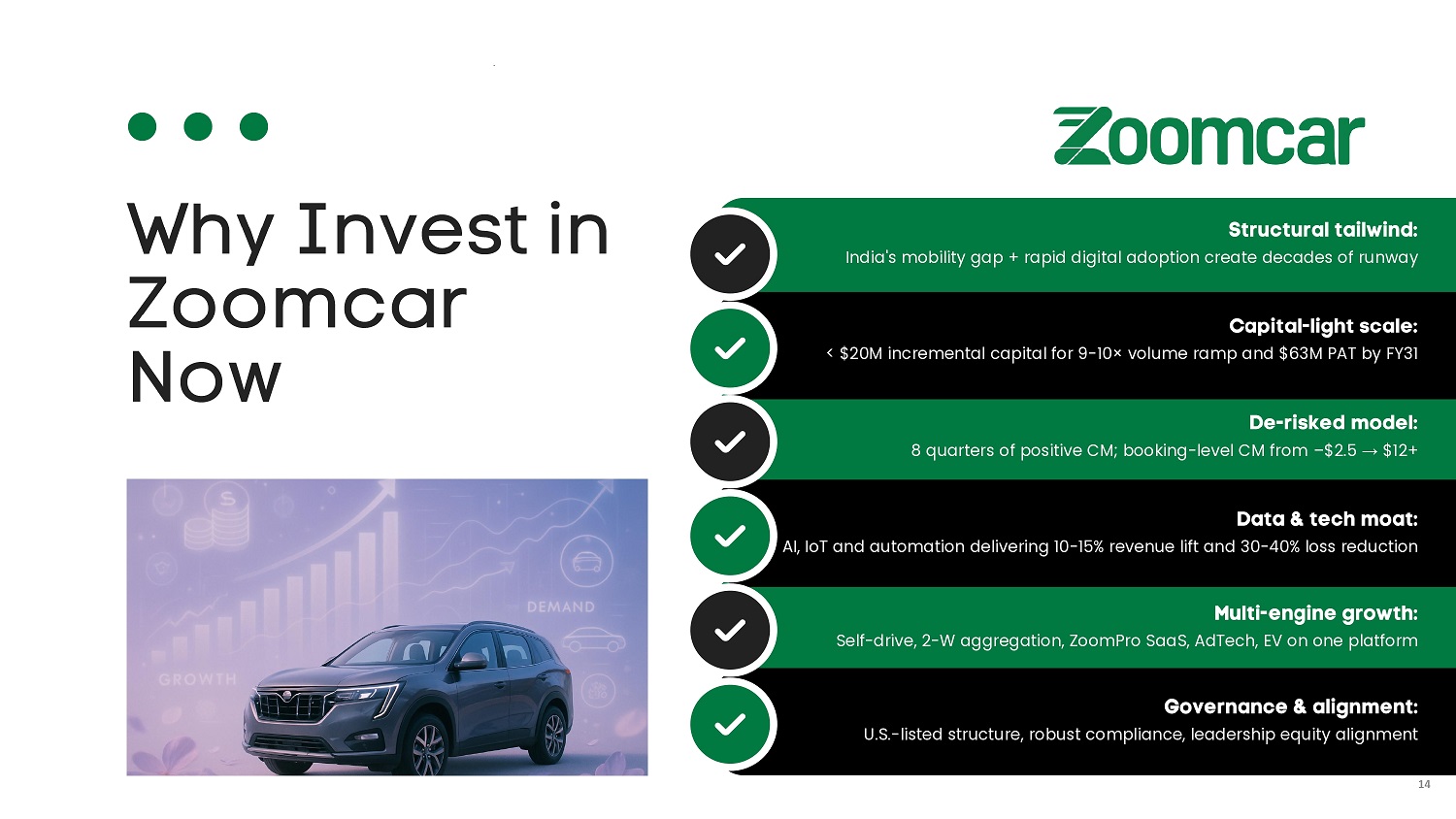 Predictive, scalable platform • AI pricing + IoT + API integrations • 100M+ data points • 30 - 40% loss reduction and margin expansion Organic demand & discipline • 700K → 6.5M monthly searches on roadmap • CAC < $2 with high organic mix • ~85% GBV from repeat/referral at scale • Path to EPAT+ by FY28 Leadership continuity & expertise • >5 years average CXO tenure • Debt reduced from $30M to ~$13M as of 31 st Dec 2025 • Multiple consecutive quarters of CM+ • Crisis - tested execution engine Multi - vertical addressability • 107K cars + 229K 2 - wheelers • ZoomPro, AdTech & EV revenue streams • FY31 outlook: $128M revenue run - rate with diversified sources Perfect market timing • 65M addressable self - drive guests by 2031 • 4.4M listable cars and widening affordability gap (5 - 6 í GDP/capita) • Positioned to lead consolidation of $10B+ urban mobility white space 13