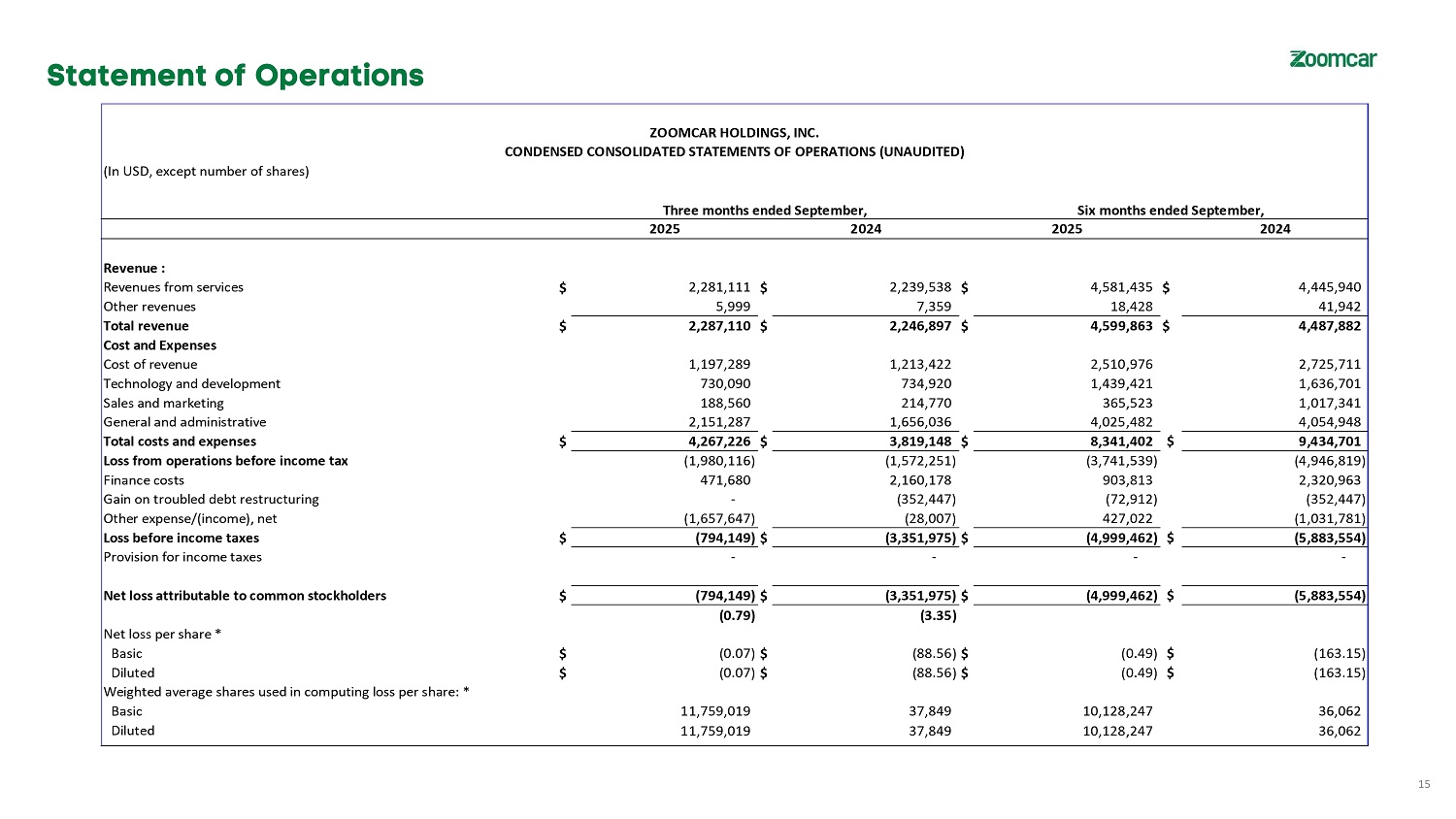 ZOOMCAR HOLDINGS, INC. CONDENSED CONSOLIDATED STATEMENTS OF OPERATIONS (UNAUDITED) Three months ended September, Six months ended September, (In USD, except number of shares) 2024 2025 2024 2025 Revenue : 4,445,940 $ 2,281,111 $ 2,239,538 $ 4,581,435 $ Revenues from services 41,942 5,999 7,359 18,428 Other revenues 4,487,882 $ 2,287,110 $ 2,246,897 $ 4,599,863 $ Total revenue Cost and Expenses 2,725,711 1,197,289 1,213,422 2,510,976 Cost of revenue 1,636,701 730,090 734,920 1,439,421 Technology and development 1,017,341 188,560 214,770 365,523 Sales and marketing 4,054,948 2,151,287 1,656,036 4,025,482 General and administrative 9,434,701 $ 4,267,226 $ 3,819,148 $ 8,341,402 $ Total costs and expenses (4,946,819) (1,980,116) (1,572,251) (3,741,539) Loss from operations before income tax 2,320,963 471,680 2,160,178 903,813 Finance costs (352,447) - (352,447) (72,912) Gain on troubled debt restructuring (1,031,781) (1,657,647) (28,007) 427,022 Other expense/(income), net (5,883,554) $ (794,149) $ (3,351,975) $ (4,999,462) $ Loss before income taxes - - - - Provision for income taxes (5,883,554) $ (794,149) $ (3,351,975) $ (4,999,462) $ Net loss attributable to common stockholders (0.79) (3.35) Net loss per share * (163.15) $ (0.07) $ (88.56) $ (0.49) $ Basic (163.15) $ (0.07) $ (88.56) $ (0.49) $ Diluted Weighted average shares used in computing loss per share: * 36,062 11,759,019 37,849 10,128,247 Basic 36,062 11,759,019 37,849 10,128,247 Diluted 15