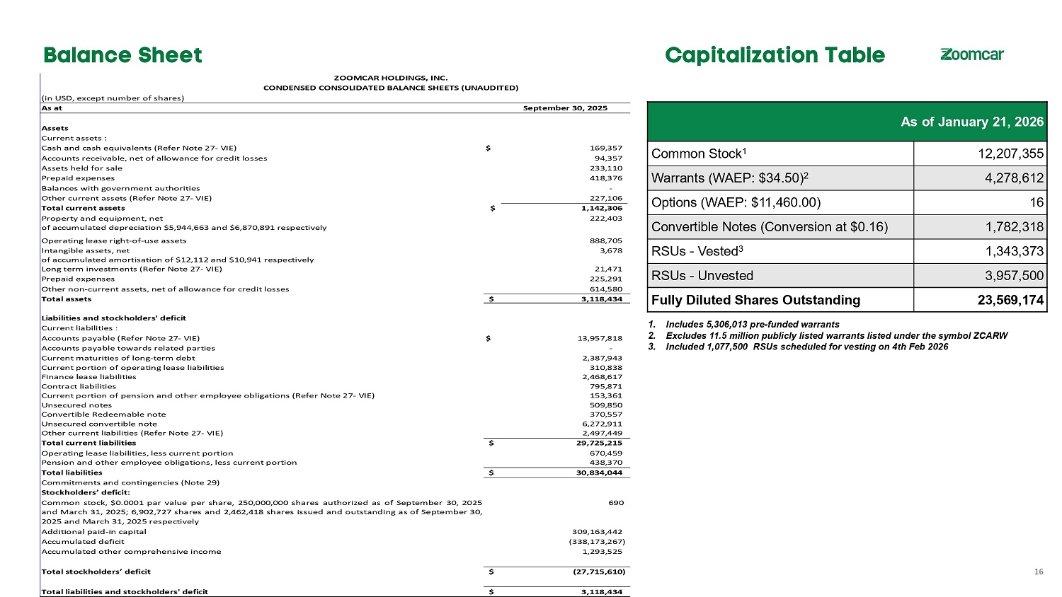 ZOOMCAR HOLDINGS, INC. CONDENSED CONSOLIDATED BALANCE SHEETS (UNAUDITED) (in USD, except number of shares) As at September 30, 2025 Assets Current assets : 169,357 $ Cash and cash equivalents (Refer Note 27 - VIE) 94,357 Accounts receivable, net of allowance for credit losses 233,110 Assets held for sale 418,376 Prepaid expenses Balances with government authorities - Other current assets (Refer Note 27 - VIE) 227,106 1,142,306 $ Total current assets 222,403 Property and equipment, net of accumulated depreciation $5,944,663 and $6,870,891 respectively 888,705 Operating lease right - of - use assets 3,678 Intangible assets, net 21,471 of accumulated amortisation of $12,112 and $10,941 respectively Long term investments (Refer Note 27 - VIE) 225,291 Prepaid expenses 614,580 Other non - current assets, net of allowance for credit losses Total assets $ 3,118,434 Liabilities and stockholders' deficit Current liabilities : 1. Includes 5,306,013 pre - funded warrants 16 Total stockholders’ deficit $ (27,715,610) Total liabilities and stockholders' deficit $ 3,118,434 Excludes 11.5 million publicly listed warrants listed under the symbol ZCARW 2. 13,957,818 $ Accounts payable (Refer Note 27 - VIE) Included 1,077,500 RSUs scheduled for vesting on 4th Feb 2026 3. - Accounts payable towards related parties 2,387,943 Current maturities of long - term debt 310,838 Current portion of operating lease liabilities 2,468,617 Finance lease liabilities 795,871 Contract liabilities 153,361 Current portion of pension and other employee obligations (Refer Note 27 - VIE) 509,850 Unsecured notes 370,557 Convertible Redeemable note 6,272,911 Unsecured convertible note 2,497,449 Other current liabilities (Refer Note 27 - VIE) 29,725,215 $ Total current liabilities 670,459 Operating lease liabilities, less current portion 438,370 Pension and other employee obligations, less current portion 30,834,044 $ Total liabilities Commitments and contingencies (Note 29) 690 Stockholders’ deficit: Common stock, $0.0001 par value per share, 250,000,000 shares authorized as of September 30, 2025 and March 31, 2025; 6,902,727 shares and 2,462,418 shares issued and outstanding as of September 30, 2025 and March 31, 2025 respectively 309,163,442 Additional paid - in capital (338,173,267) Accumulated deficit 1,293,525 Accumulated other comprehensive income As of January 21, 2026 12,207,355 Common Stock 1 4,278,612 Warrants (WAEP: $34.50) 2 16 Options (WAEP: $11,460.00) 1,782,318 Convertible Notes (Conversion at $0.16) 1,343,373 RSUs - Vested 3 3,957,500 RSUs - Unvested 23,569,174 Fully Diluted Shares Outstanding