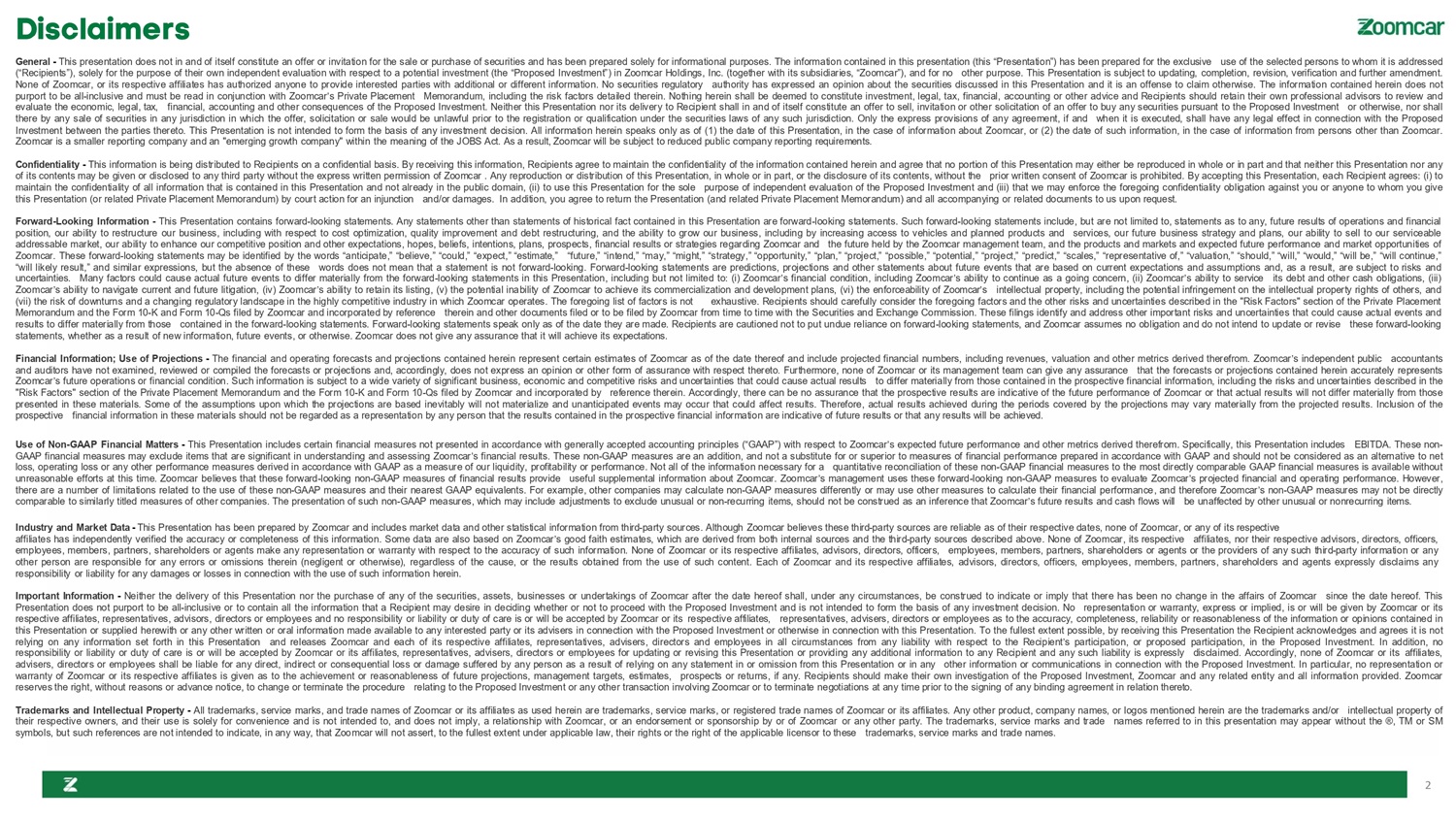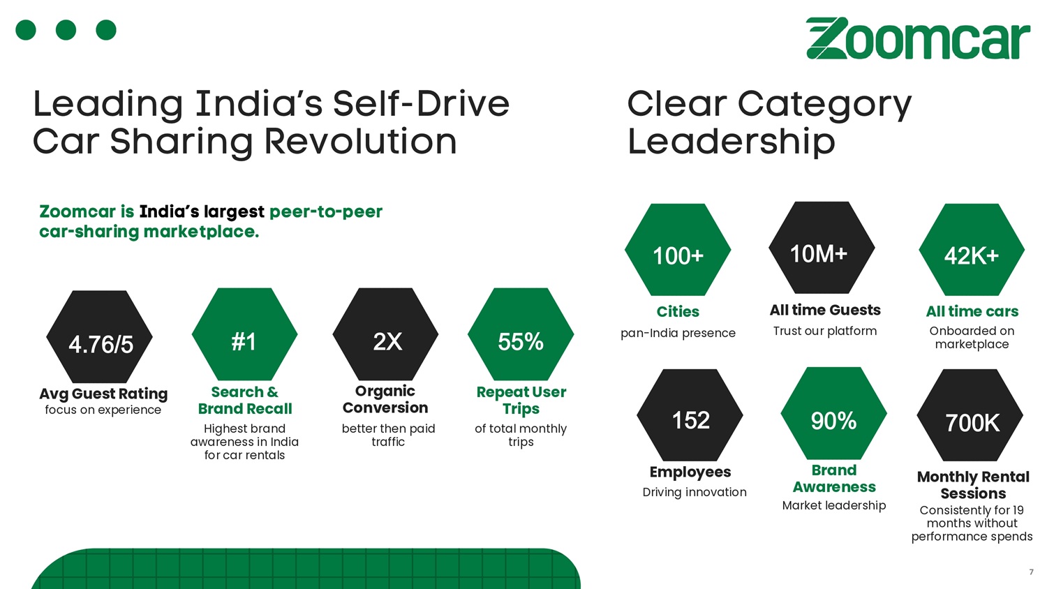 General - This presentation does not in and of itself constitute an offer or invitation for the sale or purchase of securities and has been prepared solely for informational purposes . The information contained in this presentation (this “Presentation”) has been prepared for the exclusive use of the selected persons to whom it is addressed (“Recipients”), solely for the purpose of their own independent evaluation with respect to a potential investment (the “Proposed Investment”) in Zoomcar Holdings, Inc . (together with its subsidiaries, “Zoomcar”), and for no other purpose . This Presentation is subject to updating, completion, revision, verification and further amendment . None of Zoomcar, or its respective affiliates has authorized anyone to provide interested parties with additional or different information . No securities regulatory authority has expressed an opinion about the securities discussed in this Presentation and it is an offense to claim otherwise . The information contained herein does not purport to be all - inclusive and must be read in conjunction with Zoomcar’s Private Placement Memorandum, including the risk factors detailed therein . Nothing herein shall be deemed to constitute investment, legal, tax, financial, accounting or other advice and Recipients should retain their own professional advisors to review and evaluate the economic, legal, tax, financial, accounting and other consequences of the Proposed Investment . Neither this Presentation nor its delivery to Recipient shall in and of itself constitute an offer to sell, invitation or other solicitation of an offer to buy any securities pursuant to the Proposed Investment or otherwise, nor shall there by any sale of securities in any jurisdiction in which the offer, solicitation or sale would be unlawful prior to the registration or qualification under the securities laws of any such jurisdiction . Only the express provisions of any agreement, if and when it is executed, shall have any legal effect in connection with the Proposed Investment between the parties thereto . This Presentation is not intended to form the basis of any investment decision . All information herein speaks only as of ( 1 ) the date of this Presentation, in the case of information about Zoomcar, or ( 2 ) the date of such information, in the case of information from persons other than Zoomcar . Zoomcar is a smaller reporting company and an "emerging growth company" within the meaning of the JOBS Act . As a result, Zoomcar will be subject to reduced public company reporting requirements . Confidentiality - This information is being distributed to Recipients on a confidential basis . By receiving this information, Recipients agree to maintain the confidentiality of the information contained herein and agree that no portion of this Presentation may either be reproduced in whole or in part and that neither this Presentation nor any of its contents may be given or disclosed to any third party without the express written permission of Zoomcar . Any reproduction or distribution of this Presentation, in whole or in part, or the disclosure of its contents, without the prior written consent of Zoomcar is prohibited . By accepting this Presentation, each Recipient agrees : (i) to maintain the confidentiality of all information that is contained in this Presentation and not already in the public domain, (ii) to use this Presentation for the sole purpose of independent evaluation of the Proposed Investment and (iii) that we may enforce the foregoing confidentiality obligation against you or anyone to whom you give this Presentation (or related Private Placement Memorandum) by court action for an injunction and/or damages . In addition, you agree to return the Presentation (and related Private Placement Memorandum) and all accompanying or related documents to us upon request . Forward - Looking Information - This Presentation contains forward - looking statements . Any statements other than statements of historical fact contained in this Presentation are forward - looking statements . Such forward - looking statements include, but are not limited to, statements as to any, future results of operations and financial position, our ability to restructure our business, including with respect to cost optimization, quality improvement and debt restructuring, and the ability to grow our business, including by increasing access to vehicles and planned products and services, our future business strategy and plans, our ability to sell to our serviceable addressable market, our ability to enhance our competitive position and other expectations, hopes, beliefs, intentions, plans, prospects, financial results or strategies regarding Zoomcar and the future held by the Zoomcar management team, and the products and markets and expected future performance and market opportunities of Zoomcar . These forward - looking statements may be identified by the words “anticipate,” “believe,” “could,” “expect,” “estimate,” “future,” “intend,” “may,” “might,” “strategy,” “opportunity,” “plan,” “project,” “possible,” “potential,” “project,” “predict,” “scales,” “representative of,” “valuation,” “should,” “will,” “would,” “will be,” “will continue,” “will likely result,” and similar expressions, but the absence of these words does not mean that a statement is not forward - looking . Forward - looking statements are predictions, projections and other statements about future events that are based on current expectations and assumptions and, as a result, are subject to risks and uncertainties . Many factors could cause actual future events to differ materially from the forward - looking statements in this Presentation, including but not limited to : (i) Zoomcar’s financial condition, including Zoomcar’s ability to continue as a going concern, (ii) Zoomcar’s abilit