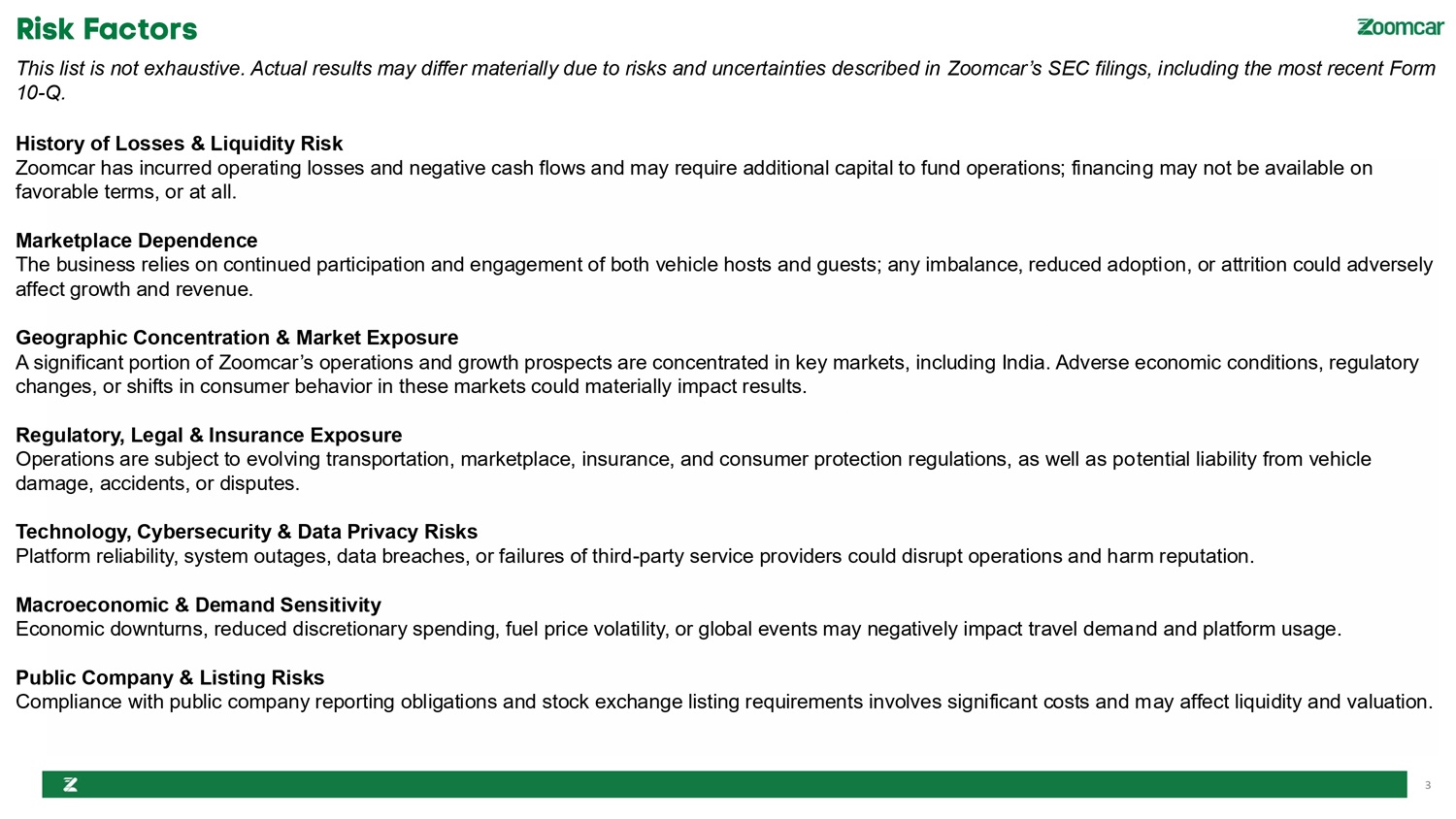 This list is not exhaustive. Actual results may differ materially due to risks and uncertainties described in Zoomcar’s SEC filings, including the most recent Form 10 - Q. History of Losses & Liquidity Risk Zoomcar has incurred operating losses and negative cash flows and may require additional capital to fund operations; financing may not be available on favorable terms, or at all. Marketplace Dependence The business relies on continued participation and engagement of both vehicle hosts and guests; any imbalance, reduced adoption, or attrition could adversely affect growth and revenue. Geographic Concentration & Market Exposure A significant portion of Zoomcar’s operations and growth prospects are concentrated in key markets, including India. Adverse economic conditions, regulatory changes, or shifts in consumer behavior in these markets could materially impact results. Regulatory, Legal & Insurance Exposure Operations are subject to evolving transportation, marketplace, insurance, and consumer protection regulations, as well as potential liability from vehicle damage, accidents, or disputes. Technology, Cybersecurity & Data Privacy Risks Platform reliability, system outages, data breaches, or failures of third - party service providers could disrupt operations and harm reputation. Macroeconomic & Demand Sensitivity Economic downturns, reduced discretionary spending, fuel price volatility, or global events may negatively impact travel demand and platform usage. Public Company & Listing Risks Compliance with public company reporting obligations and stock exchange listing requirements involves significant costs and may affect liquidity and valuation. 3