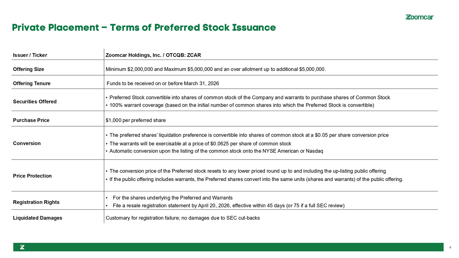 Zoomcar Holdings, Inc. / OTCQB: ZCAR Issuer / Ticker Minimum $2,000,000 and Maximum $5,000,000 and an over allotment up to additional $5,000,000. Offering Size Funds to be received on or before March 31, 2026 Offering Tenure • Preferred Stock convertible into shares of common stock of the Company and warrants to purchase shares of Common Stock • 100% warrant coverage (based on the initial number of common shares into which the Preferred Stock is convertible) Securities Offered $1,000 per preferred share Purchase Price • The preferred shares’ liquidation preference is convertible into shares of common stock at a $0.05 per share conversion price • The warrants will be exercisable at a price of $0.0625 per share of common stock • Automatic conversion upon the listing of the common stock onto the NYSE American or Nasdaq Conversion • The conversion price of the Preferred stock resets to any lower priced round up to and including the up - listing public offering • If the public offering includes warrants, the Preferred shares convert into the same units (shares and warrants) of the public offering. Price Protection • For the shares underlying the Preferred and Warrants • File a resale registration statement by April 20, 2026, effective within 45 days (or 75 if a full SEC review) Registration Rights Customary for registration failure; no damages due to SEC cut - backs Liquidated Damages 4