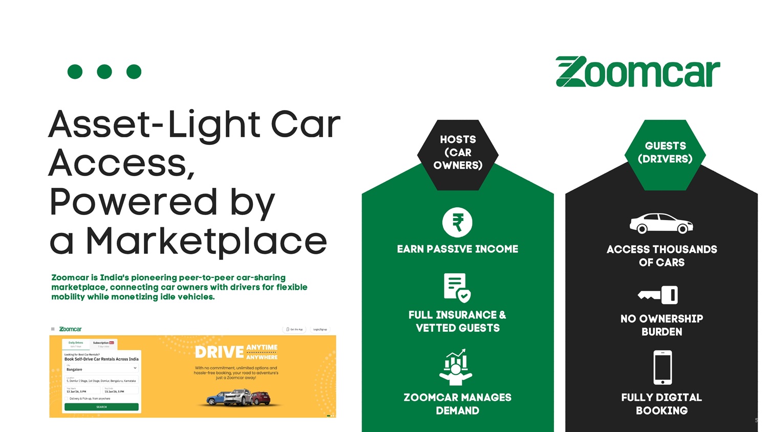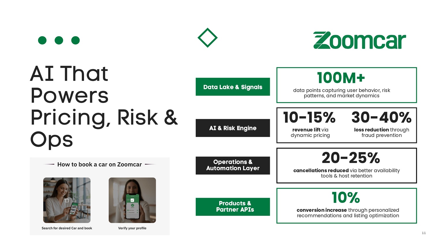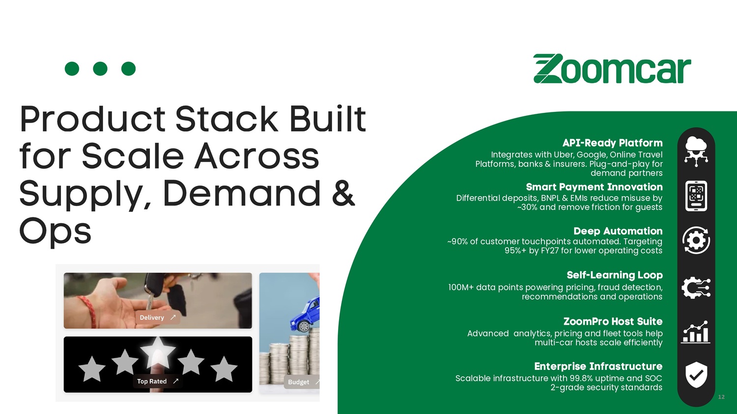 Integrates with Uber, Google, Online Travel Platforms, banks & insurers. Plug - and - play for demand partners Differential deposits, BNPL & EMIs reduce misuse by ~30% and remove friction for guests ~90% of customer touchpoints automated. Targeting 95%+ by FY27 for lower operating costs 100M+ data points powering pricing, fraud detection, recommendations and operations 12 Advanced analytics, pricing and fleet tools help multi - car hosts scale efficiently Scalable infrastructure with 99.8% uptime and SOC 2 - grade security standards