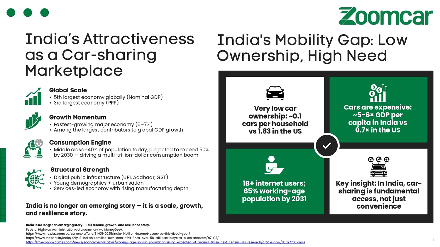 Very low car ownership: ~0.1 cars per household vs 1.83 in the US Key insight: In India, car - sharing is fundamental access, not just convenience Cars are expensive: ~5 - 6 ð GDP per capita in India vs 0.7 ð in the US 1B+ internet users; 65% working - age population by 2031 India is no longer an emerging story — it is a scale, growth, and resilience story. Federal Highway Administration data summary via MoneyGeek. https:// www.nextias.com/ca/current - affairs/31 - 05 - 2025/india - 1 - billion - internet - users - by - this - fiscal - year? https:// www.theprint.in/india/only - 8 - indian - families - own - cars - nfhs - finds - over - 50 - still - use - bicycles - bikes - scooters/971413/ https://m.economictimes.com/news/economy/indicators/working - age - indian - population - rising - expected - at - around - 64 - in - next - census - sbi - research/articleshow/113627705.cms? • 5th largest economy globally (Nominal GDP) • 3rd largest economy (PPP) • Middle class ~40% of population today, projected to exceed 50% by 2030 — driving a multi - trillion - dollar consumption boom • Fastest - growing major economy (6 – 7%) • Among the largest contributors to global GDP growth • Digital public infrastructure (UPI, Aadhaar, GST) • Young demographics + urbanisation • Services - led economy with rising manufacturing depth 6