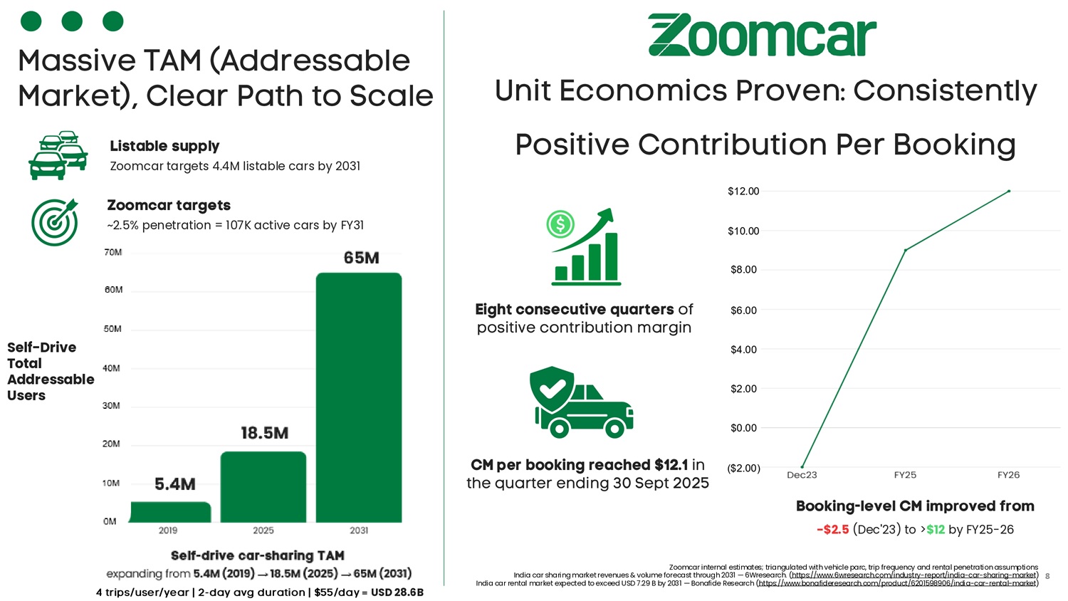 Zoomcar targets 4.4M listable cars by 2031 Zoomcar internal estimates; triangulated with vehicle parc, trip frequency and rental penetration assumptions India car sharing market revenues & volume forecast through 2031 — 6Wresearch. ( https://www.6wresearch.com/industry - report/india - car - sharing - market ) India car rental market expected to exceed USD 7.29 B by 2031 — Bonafide Research ( https://www.bonafideresearch.com/product/6201598906/india - car - rental - market ) 8 $ $ $12.00 $ 1 $ 0 . 0 0 $ 8 $ . 0 0 $ 6 $ . 0 0 $ 4 $ . 0 0 - $2.5 (Dec'23) to > $12 by FY25 - 26 $2.00 $0.00 $ ($2.00) ~2.5% penetration = 107K active cars by FY31 USD 28.6B Self - Drive Total Addressable Users