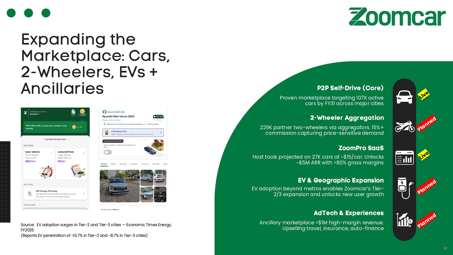 Proven marketplace targeting 107K active cars by FY31 across major cities Host tools projected on 27K cars at ~$15/car. Unlocks ~$5M ARR with >80% gross margins EV adoption beyond metros enables Zoomcar’s Tier - 2/3 expansion and unlocks new user growth Ancillary marketplace >$1M high - margin revenue. Upselling travel, insurance, auto - finance Source: EV adoption surges in Tier - 2 and Tier - 3 cities — Economic Times Energy, FY2025 (Reports EV penetration of ~10.7% in Tier - 2 and ~8.7% in Tier - 3 cities) 229K partner two - wheelers via aggregators. 15%+ commission capturing price - sensitive demand 10