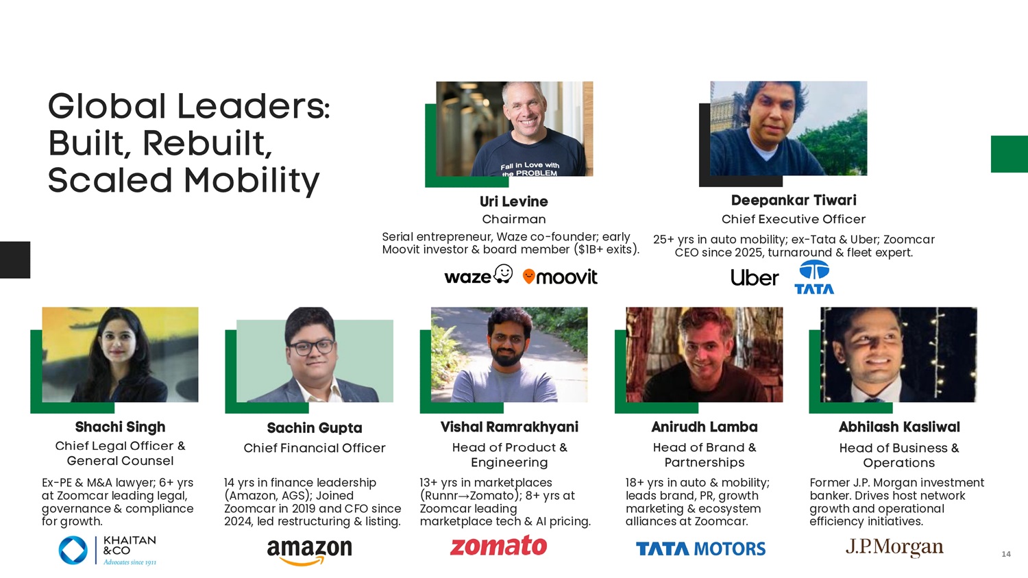 Serial entrepreneur, Waze co - founder; early Moovit investor & board member ($1B+ exits). 25+ yrs in auto mobility; ex - Tata & Uber; Zoomcar CEO since 2025, turnaround & fleet expert. Ex - PE & M&A lawyer; 6+ yrs at Zoomcar leading legal, governance & compliance for growth. 14 yrs in finance leadership (Amazon, AGS); Joined Zoomcar in 2019 and CFO since 2024, led restructuring & listing. 13+ yrs in marketplaces (Runnr → Zomato); 8+ yrs at Zoomcar leading marketplace tech & AI pricing. 18+ yrs in auto & mobility; leads brand, PR, growth marketing & ecosystem alliances at Zoomcar. Former J.P. Morgan investment banker. Drives host network growth and operational efficiency initiatives. 14