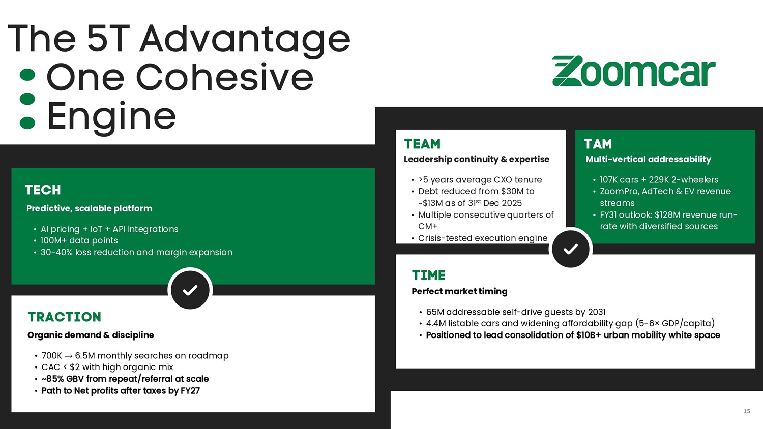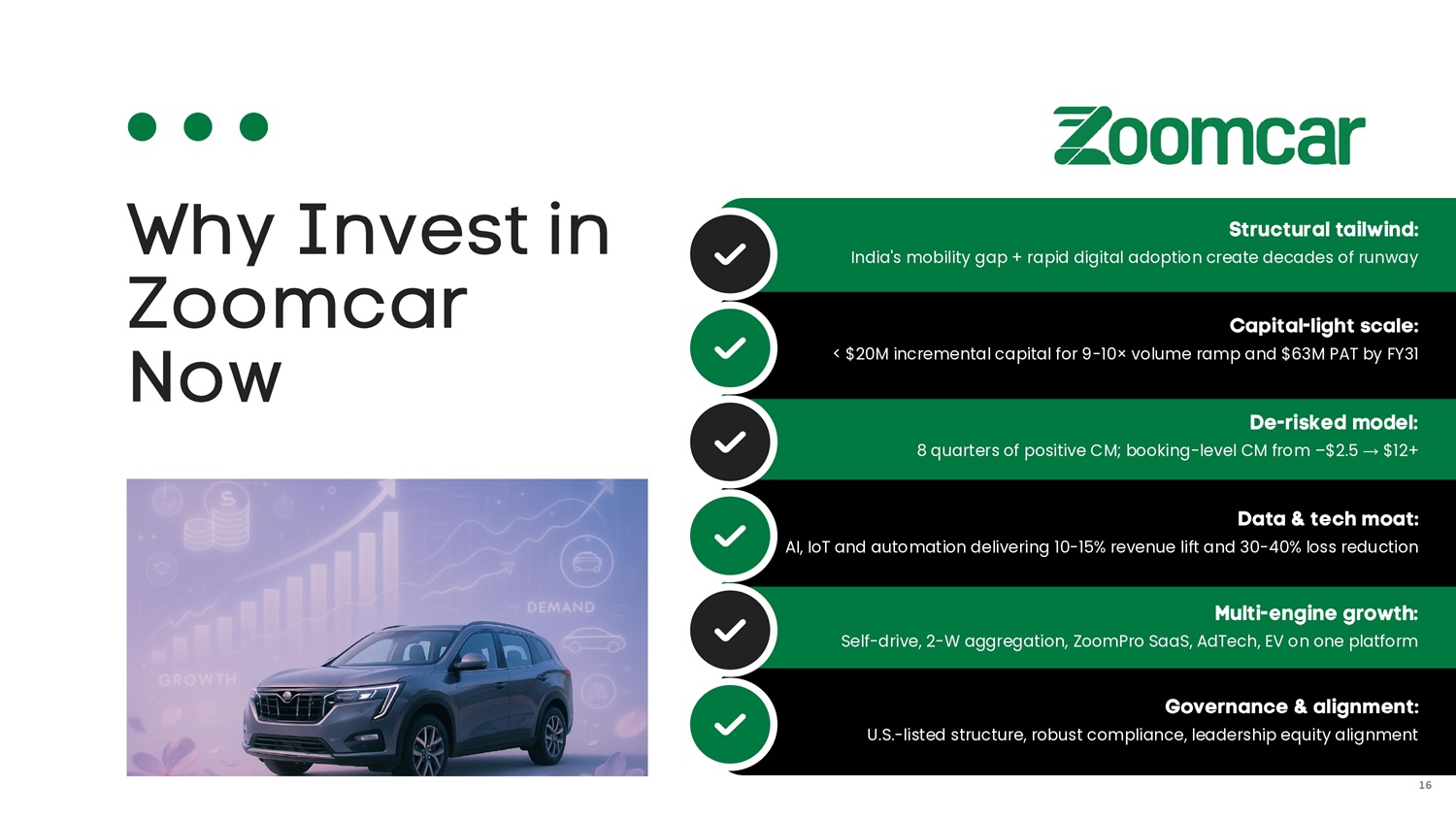 Predictive, scalable platform • AI pricing + IoT + API integrations • 100M+ data points • 30 - 40% loss reduction and margin expansion Organic demand & discipline • 700K → 6.5M monthly searches on roadmap • CAC < $2 with high organic mix • ~85% GBV from repeat/referral at scale • Path to Net profits after taxes by FY27 Leadership continuity & expertise • >5 years average CXO tenure • Debt reduced from $30M to ~$13M as of 31 st Dec 2025 • Multiple consecutive quarters of CM+ • Crisis - tested execution engine Multi - vertical addressability • 107K cars + 229K 2 - wheelers • ZoomPro, AdTech & EV revenue streams • FY31 outlook: $128M revenue run - rate with diversified sources Perfect market timing • 65M addressable self - drive guests by 2031 • 4.4M listable cars and widening affordability gap (5 - 6 í GDP/capita) • Positioned to lead consolidation of $10B+ urban mobility white space 15