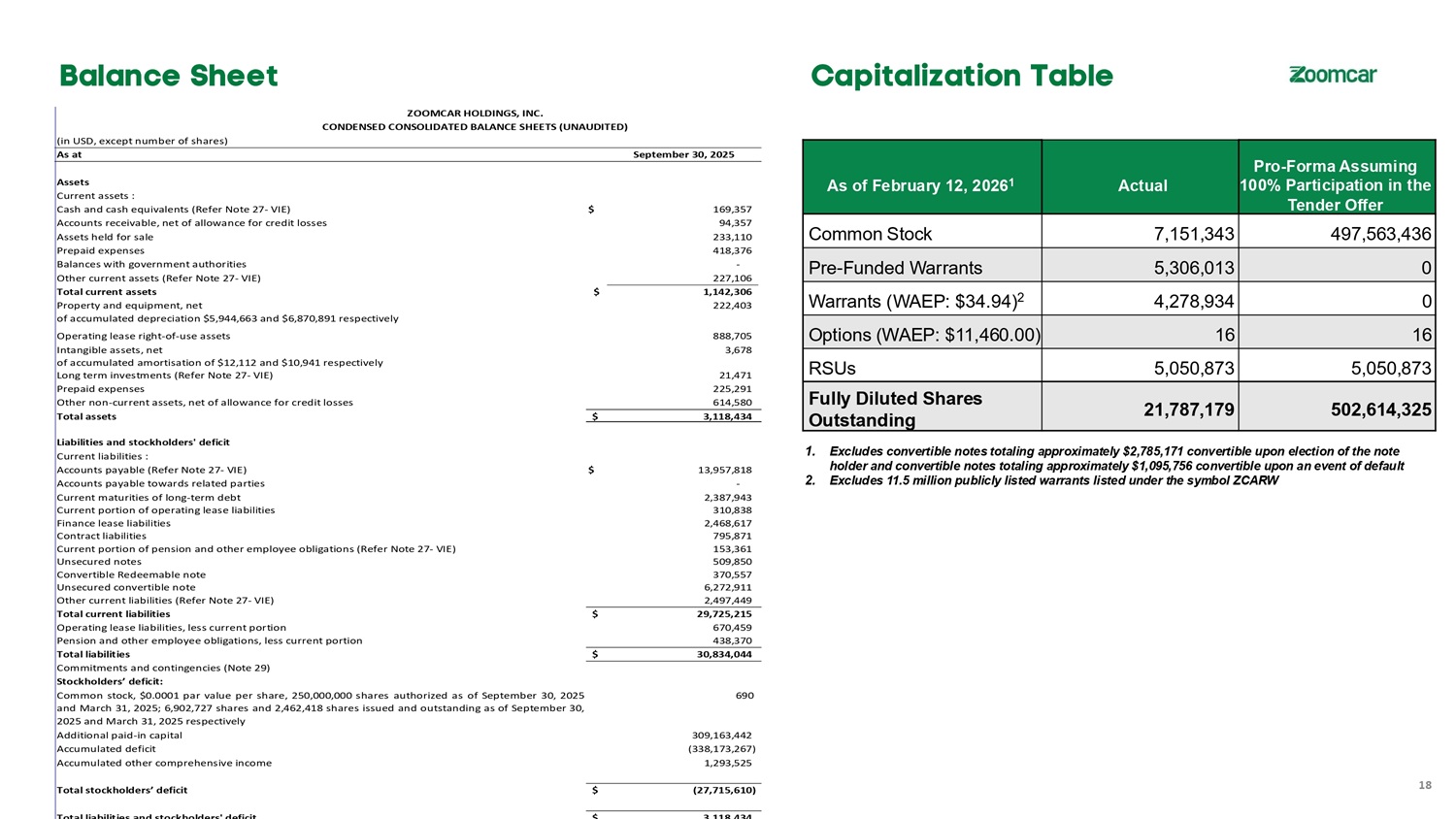 ZOOMCAR HOLDINGS, INC. CONDENSED CONSOLIDATED BALANCE SHEETS (UNAUDITED) (in USD, except number of shares) As at September 30, 2025 Assets Current assets : 169,357 $ Cash and cash equivalents (Refer Note 27 - VIE) 94,357 Accounts receivable, net of allowance for credit losses 233,110 Assets held for sale 418,376 Prepaid expenses - Balances with government authorities 227,106 Other current assets (Refer Note 27 - VIE) 1,142,306 $ Total current assets 222,403 Property and equipment, net of accumulated depreciation $5,944,663 and $6,870,891 respectively 888,705 Operating lease right - of - use assets 3,678 Intangible assets, net 21,471 of accumulated amortisation of $12,112 and $10,941 respectively Long term investments (Refer Note 27 - VIE) 225,291 Prepaid expenses 614,580 Other non - current assets, net of allowance for credit losses $ 3,118,434 Total assets Liabilities and stockholders' deficit $ 13,957,818 Current liabilities : Accounts payable (Refer Note 27 - VIE) 1. Excludes convertible notes totaling approximately $2,785,171 convertible upon election of the note holder and convertible notes totaling approximately $1,095,756 convertible upon an event of default Excludes 11.5 million publicly listed warrants listed under the symbol ZCARW 2. - 2,387,943 Accounts payable towards related parties Current maturities of long - term debt 310,838 Current portion of operating lease liabilities 2,468,617 Finance lease liabilities 795,871 Contract liabilities 153,361 Current portion of pension and other employee obligations (Refer Note 27 - VIE) 509,850 Unsecured notes 370,557 Convertible Redeemable note 6,272,911 Unsecured convertible note 2,497,449 Other current liabilities (Refer Note 27 - VIE) $ 29,725,215 Total current liabilities 670,459 Operating lease liabilities, less current portion 438,370 Pension and other employee obligations, less current portion $ 30,834,044 Total liabilities Commitments and contingencies (Note 29) Stockholders’ deficit: 690 Common stock, $0.0001 par value per share, 250,000,000 shares authorized as of September 30, 2025 and March 31, 2025; 6,902,727 shares and 2,462,418 shares issued and outstanding as of September 30, 2025 and March 31, 2025 respectively 309,163,442 Additional paid - in capital (338,173,267) Accumulated deficit 1,293,525 Accumulated other comprehensive income $ (27,715,610) Total stockholders’ deficit $ 3,118,434 Total liabilities and stockholders' deficit Pro - Forma Assuming 100% Participation in the Tender Offer Actual As of February 12, 2026 1 497,563,436 7,151,343 Common Stock 0 5,306,013 Pre - Funded Warrants 0 4,278,934 Warrants (WAEP: $34.94) 2 16 16 Options (WAEP: $11,460.00) 5,050,873 5,050,873 RSUs 502,614,325 21,787,179 Fully Diluted Shares Outstanding 18