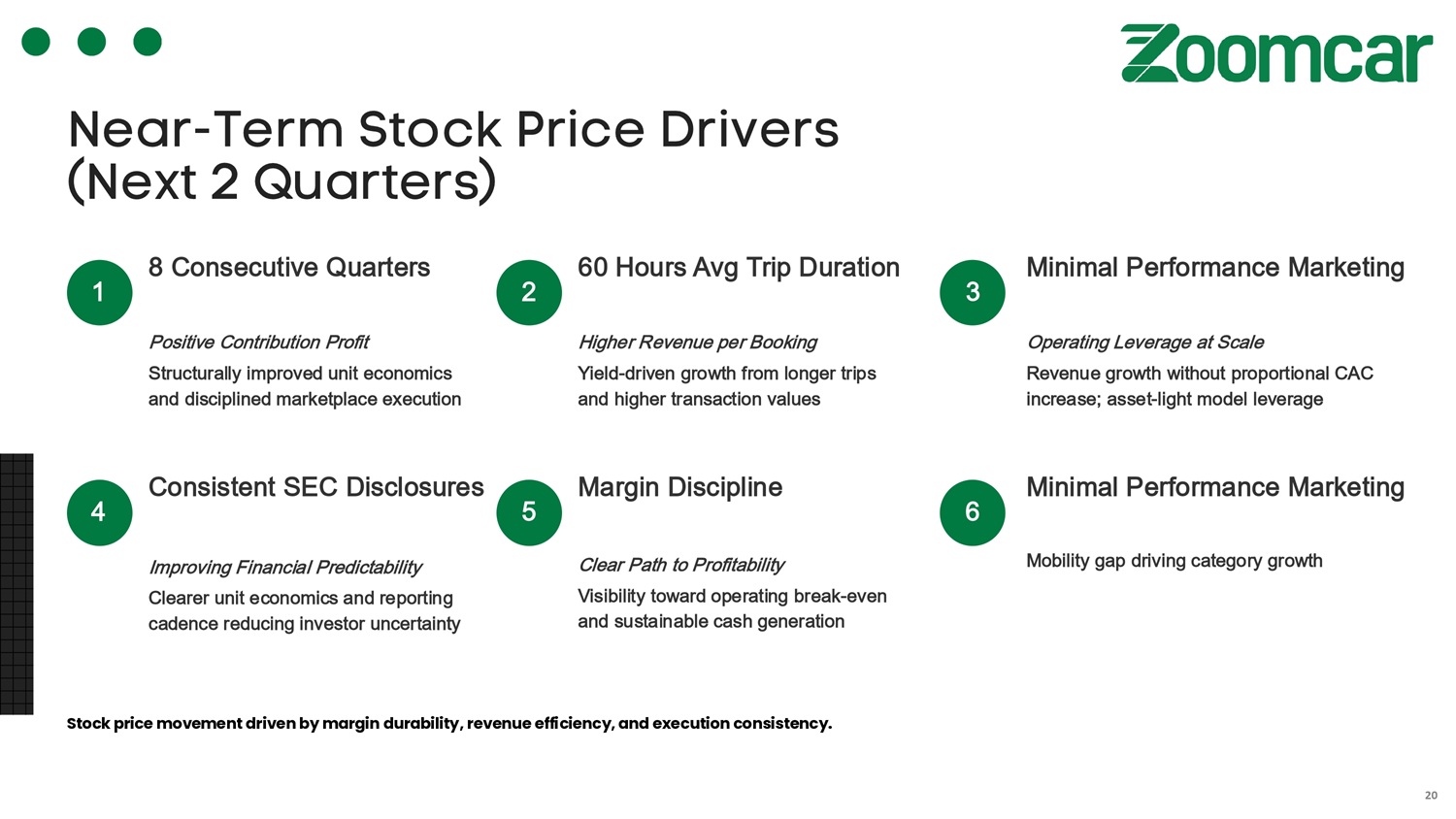 Positive Contribution Profit Structurally improved unit economics and disciplined marketplace execution Improving Financial Predictability Clearer unit economics and reporting cadence reducing investor uncertainty Higher Revenue per Booking Yield - driven growth from longer trips and higher transaction values Clear Path to Profitability Visibility toward operating break - even and sustainable cash generation Operating Leverage at Scale Revenue growth without proportional CAC increase; asset - light model leverage Mobility gap driving category growth 8 Consecutive Quarters 1 2 3 4 5 6 Consistent SEC Disclosures 60 Hours Avg Trip Duration Margin Discipline Minimal Performance Marketing Minimal Performance Marketing Stock price movement driven by margin durability, revenue efficiency, and execution consistency. 20