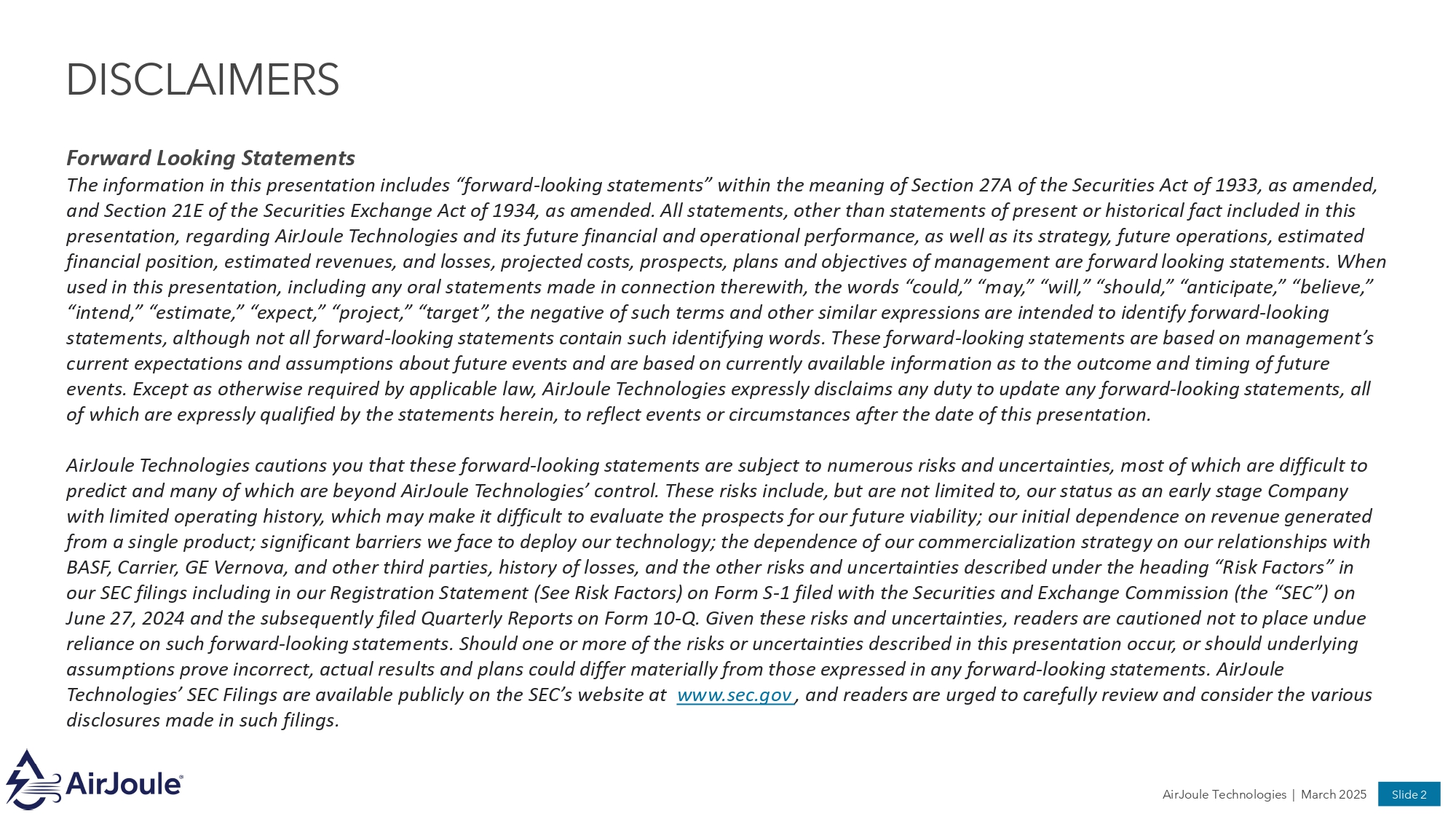DISCLAIMERS AirJoule Technologies | March 2025 Slide 2 Forward Looking Statements The information in this presentation includes “forward - looking statements” within the meaning of Section 27A of the Securities Act of 1933, as amended, and Section 21E of the Securities Exchange Act of 1934, as amended. All statements, other than statements of present or historical fact included in this presentation, regarding AirJoule Technologies and its future financial and operational performance, as well as its strategy, future operations, estimated financial position, estimated revenues, and losses, projected costs, prospects, plans and objectives of management are forward looking statements. When used in this presentation, including any oral statements made in connection therewith, the words “could,” “may,” “will,” “should,” “anticipate,” “believe,” “intend,” “estimate,” “expect,” “project,” “target”, the negative of such terms and other similar expressions are intended to identify forward - looking statements, although not all forward - looking statements contain such identifying words. These forward - looking statements are based on management’s current expectations and assumptions about future events and are based on currently available information as to the outcome and timing of future events. Except as otherwise required by applicable law, AirJoule Technologies expressly disclaims any duty to update any forward - looking statements, all of which are expressly qualified by the statements herein, to reflect events or circumstances after the date of this presentation. AirJoule Technologies cautions you that these forward - looking statements are subject to numerous risks and uncertainties, most of which are difficult to predict and many of which are beyond AirJoule Technologies’ control. These risks include, but are not limited to, our status as an early stage Company with limited operating history, which may make it difficult to evaluate the prospects for our future viability; our initial dependence on revenue generated from a single product; significant barriers we face to deploy our technology; the dependence of our commercialization strategy on our relationships with BASF, Carrier, GE Vernova, and other third parties, history of losses, and the other risks and uncertainties described under the heading “Risk Factors” in our SEC filings including in our Registration Statement (See Risk Factors) on Form S - 1 filed with the Securities and Exchange Commission (the “SEC”) on June 27, 2024 and the subsequently filed Quarterly Reports on Form 10 - Q. Given these risks and uncertainties, readers are cautioned not to place undue reliance on such forward - looking statements. Should one or more of the risks or uncertainties described in this presentation occur, or should underlying assumptions prove incorrect, actual results and plans could differ materially from those expressed in any forward - looking statements. AirJoule Technologies’ SEC Filings are available publicly on the SEC’s website at www.sec.gov , and readers are urged to carefully review and consider the various disclosures made in such filings.