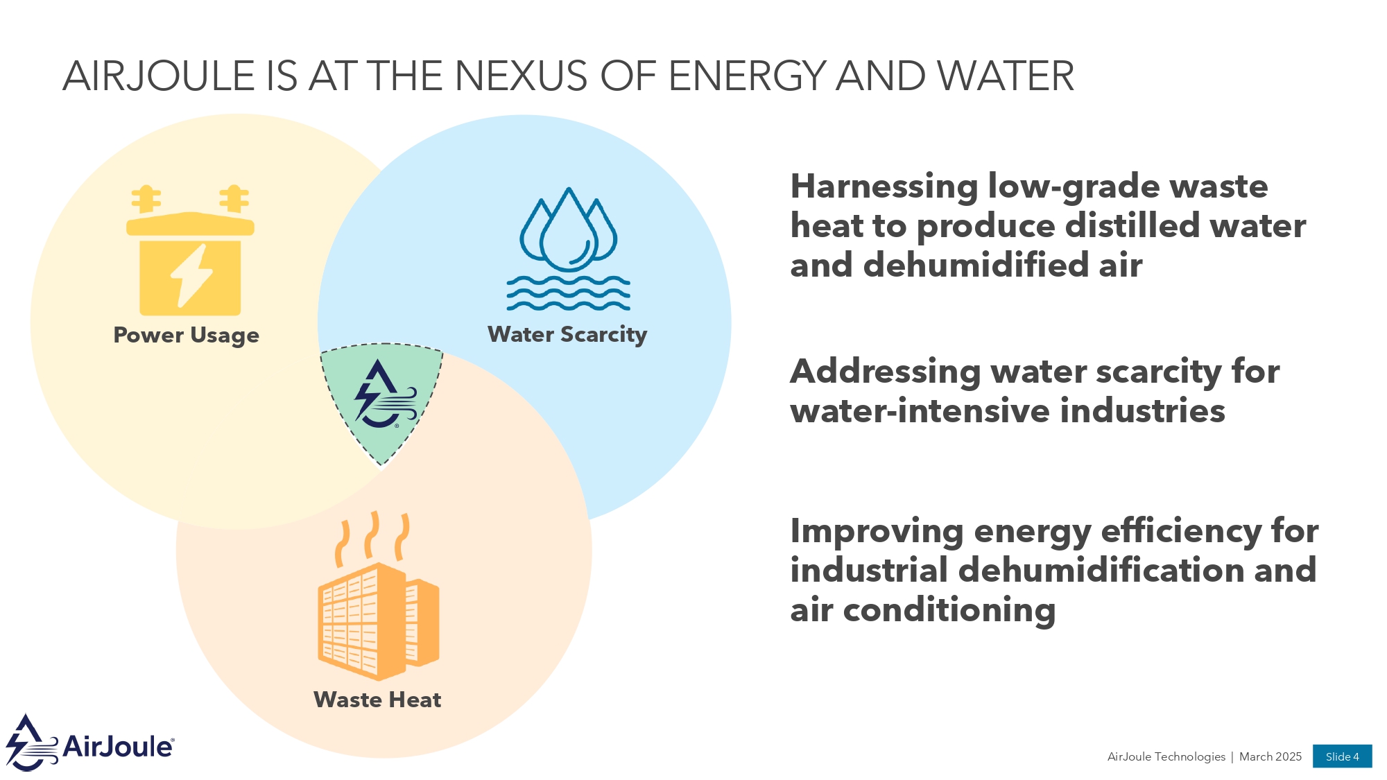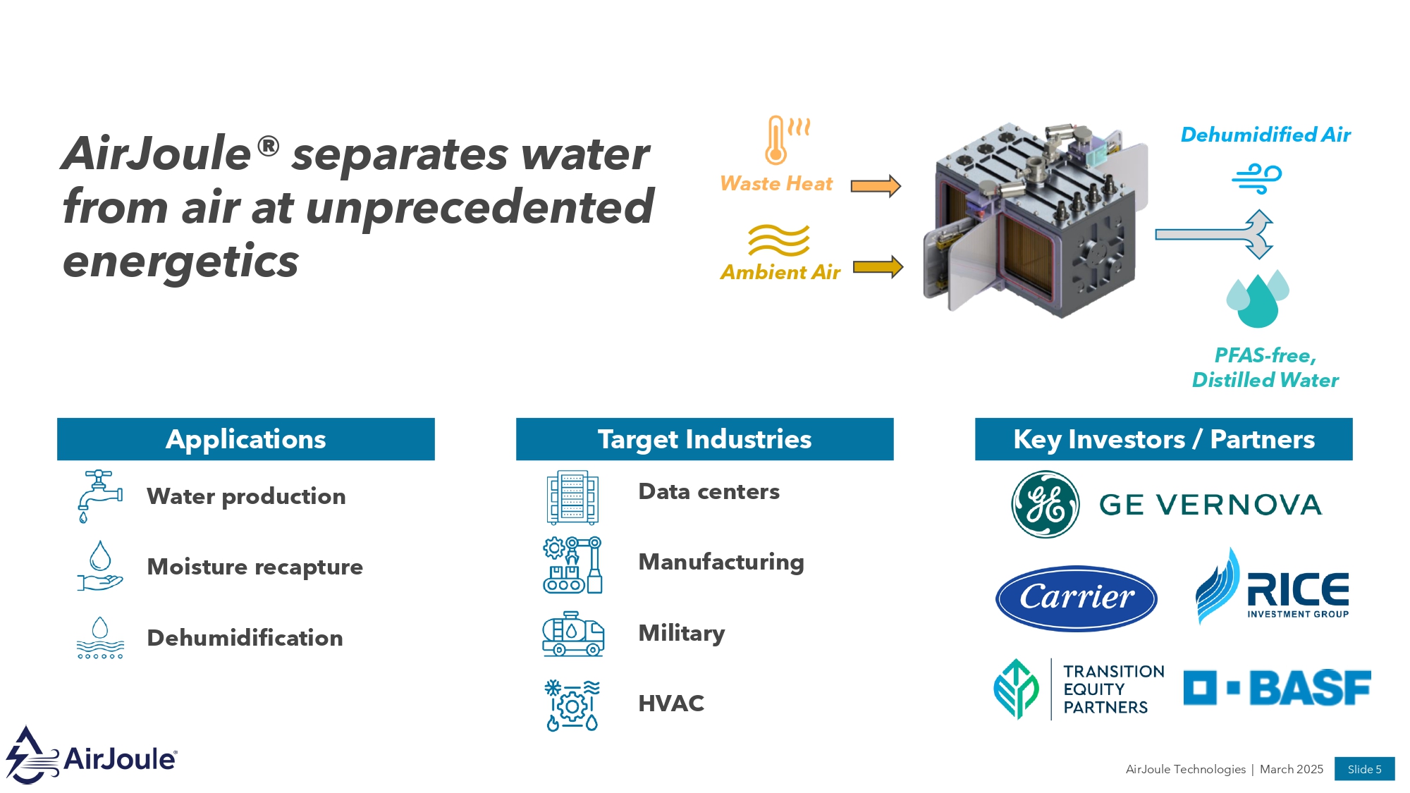 AIRJOULE IS AT THE NEXUS OF ENERGY AND WATER Harnessing low - grade waste heat to produce distilled water and dehumidified air Addressing water scarcity for water - intensive industries Improving energy efficiency for industrial dehumidification and air conditioning Waste Heat Power Usage Water Scarcity AirJoule Technologies | March 2025 Slide 4