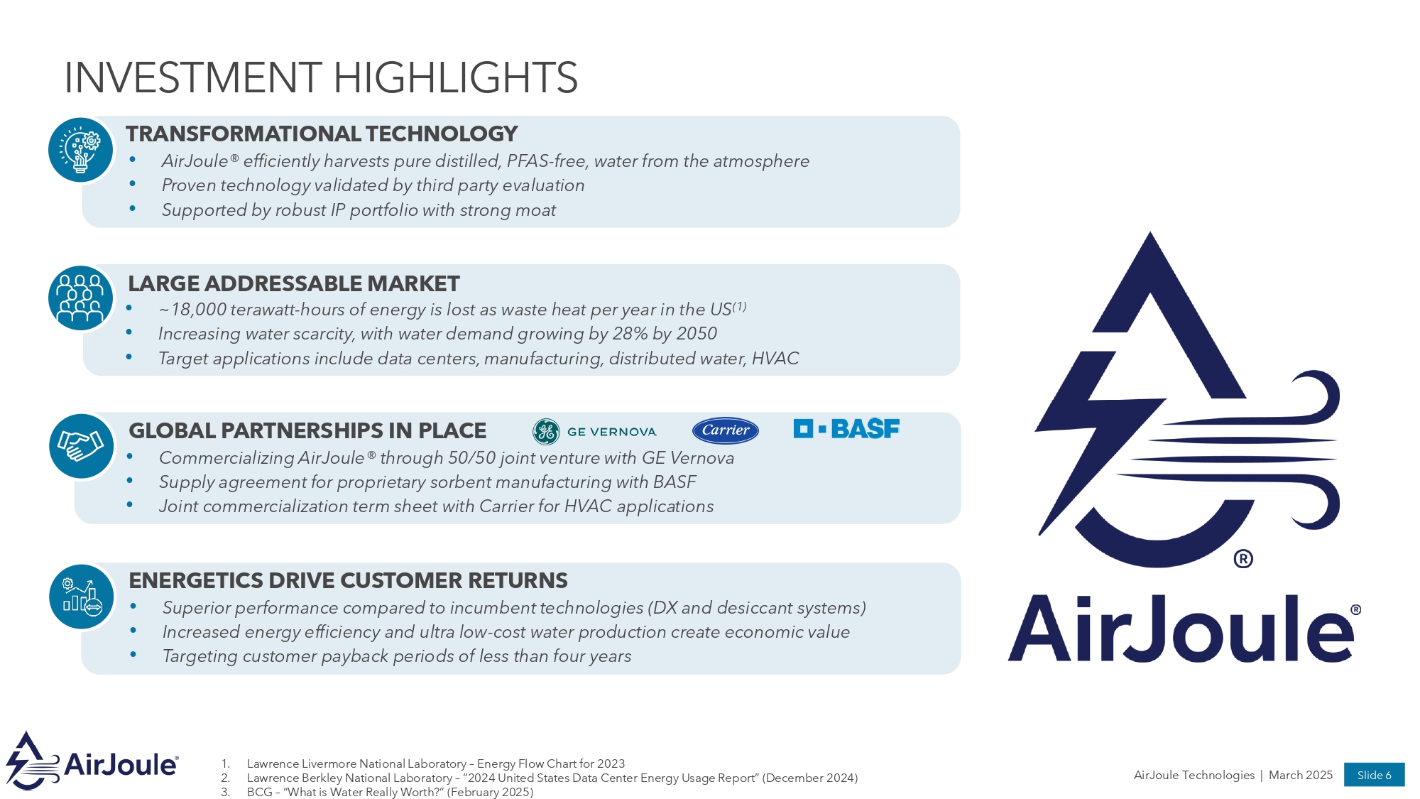 AirJoule® separates water from air at unprecedented energetics Applications Target Industries Water production Moisture recapture Dehumidification Data centers Manufacturing Military HVAC Key Investors / Partners Ambient Air PFAS - free, Distilled Water Dehumidified Air Waste Heat AirJoule Technologies | March 2025 Slide 5