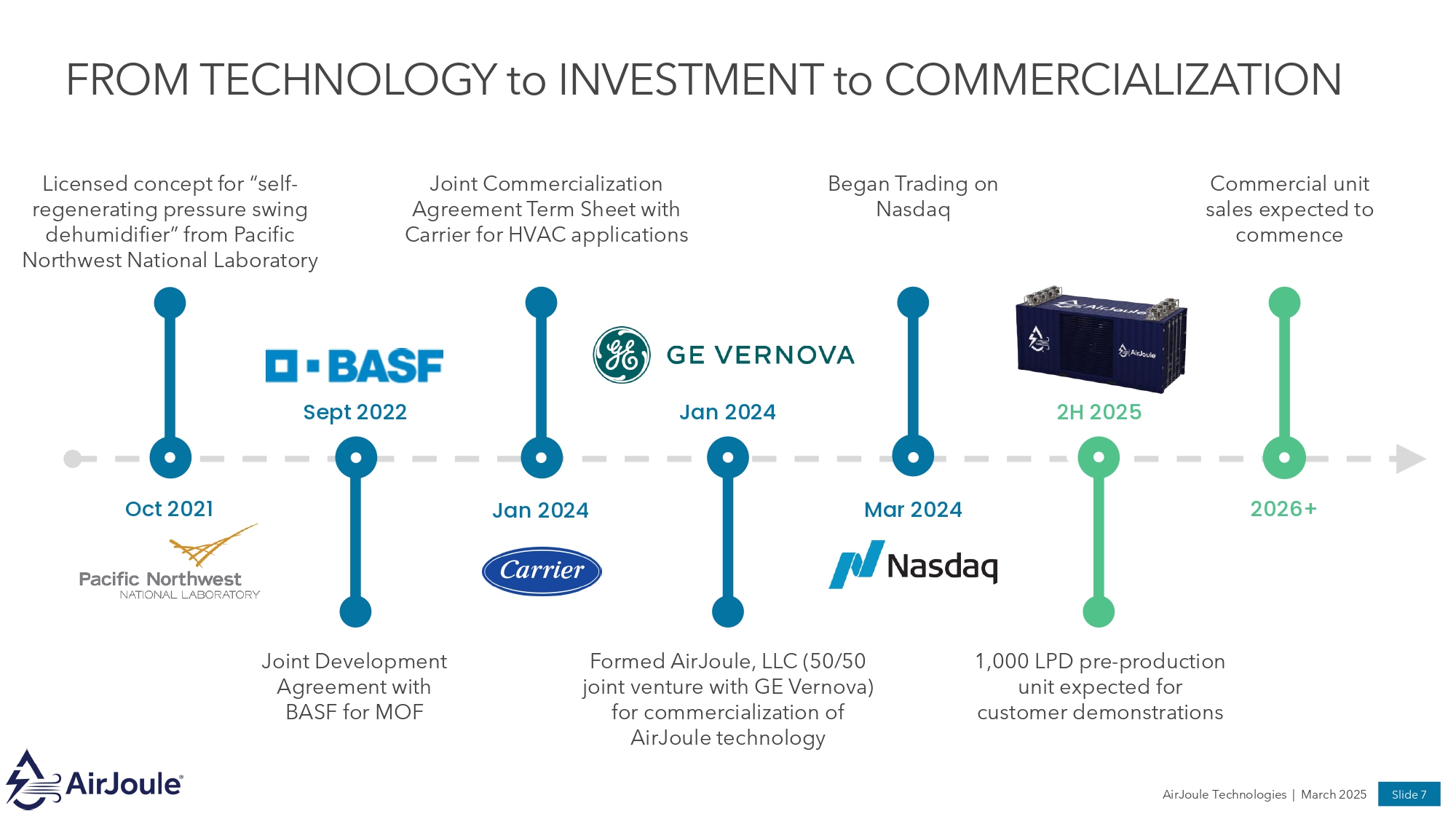Slide 6 AirJoule Technologies | March 2025 INVESTMENT HIGHLIGHTS TRANSFORMATIONAL TECHNOLOGY • AirJoule® efficiently harvests pure distilled, PFAS - free, water from the atmosphere • Proven technology validated by third party evaluation • Supported by robust IP portfolio with strong moat LARGE ADDRESSABLE MARKET • ~18,000 terawatt - hours of energy is lost as waste heat per year in the US (1) • Increasing water scarcity, with water demand growing by 28% by 2050 • Target applications include data centers, manufacturing, distributed water, HVAC GLOBAL PARTNERSHIPS IN PLACE • Commercializing AirJoule® through 50/50 joint venture with GE Vernova • Supply agreement for proprietary sorbent manufacturing with BASF • Joint commercialization term sheet with Carrier for HVAC applications ENERGETICS DRIVE CUSTOMER RETURNS • Superior performance compared to incumbent technologies (DX and desiccant systems) • Increased energy efficiency and ultra low - cost water production create economic value • Targeting customer payback periods of less than four years 1. Lawrence Livermore National Laboratory – Energy Flow Chart for 2023 2. Lawrence Berkley National Laboratory – “2024 United States Data Center Energy Usage Report” (December 2024) 3. BCG – “What is Water Really Worth?” (February 2025)