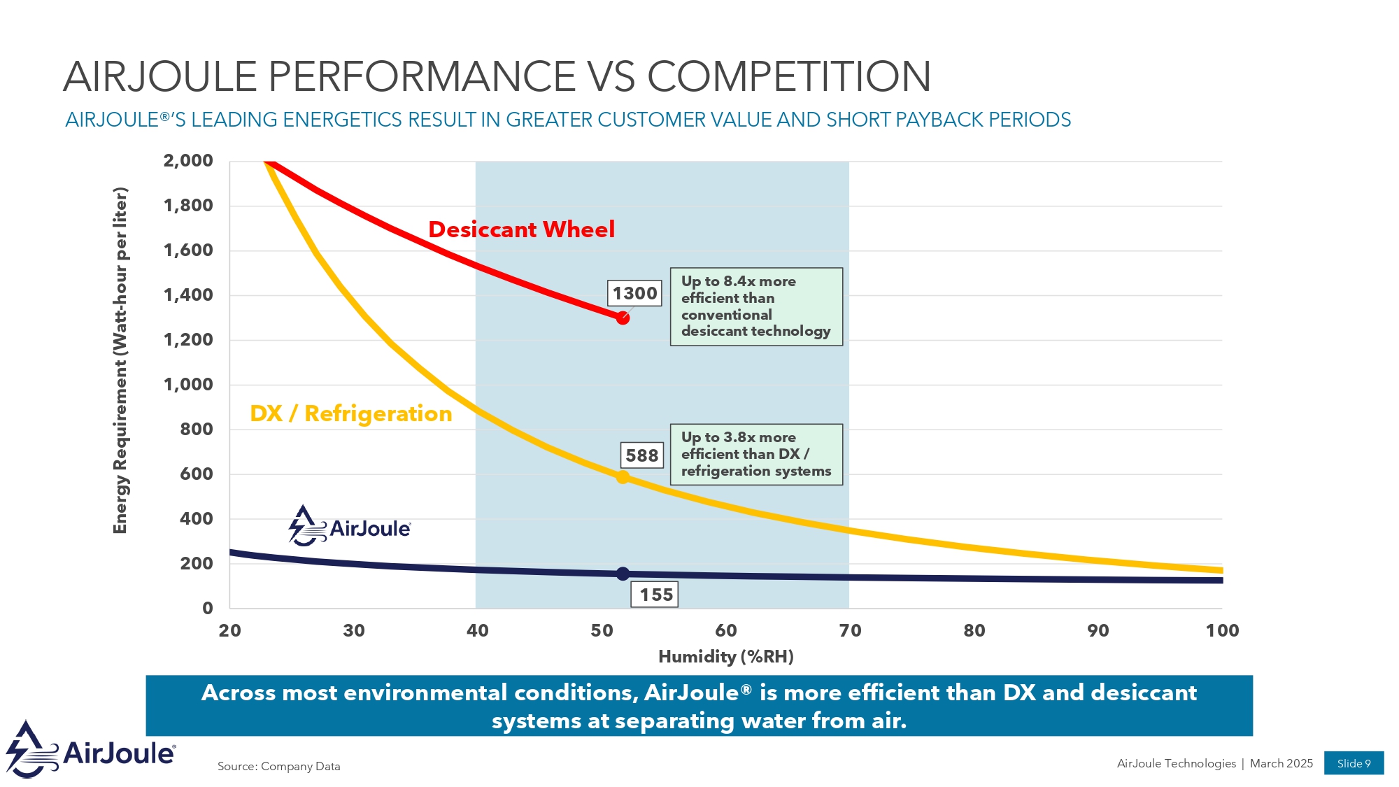 HOW AIRJOULE ® WORKS Pure Water AMBIENT AIR Sorbent - coated Contactor Air is drawn through proprietary sorbent - coated contactors, and water vapor is captured Once sorbent is full of water vapor, chamber doors close and vacuum is applied Under vacuum, waste heat is added to optimize desorption, and water vapor is released Water vapor condenses to liquid water inside the vacuum condenser 1 2 3 4 5 Water vapor capture and release cycles occur simultaneously in separate chambers; internal heat is recovered which enables superior energetics 1 2 3 4 5 DRY AIR Proprietary AirJoule® technology efficiently produces pure distilled water from air using ambient air and waste heat AirJoule ® Process Description AirJoule ® Process Diagram WASTE HEAT AirJoule Technologies | March 2025 Slide 8