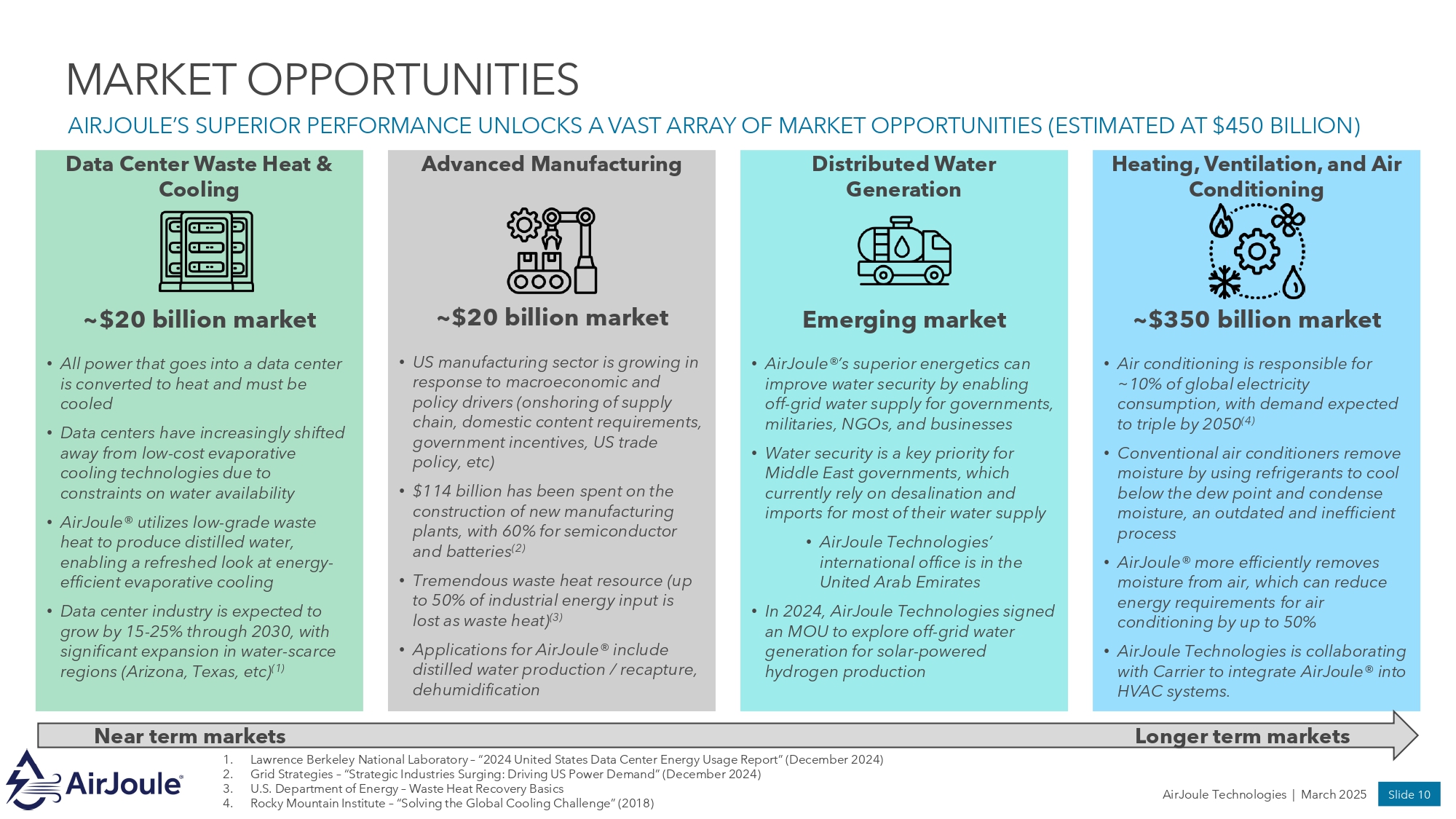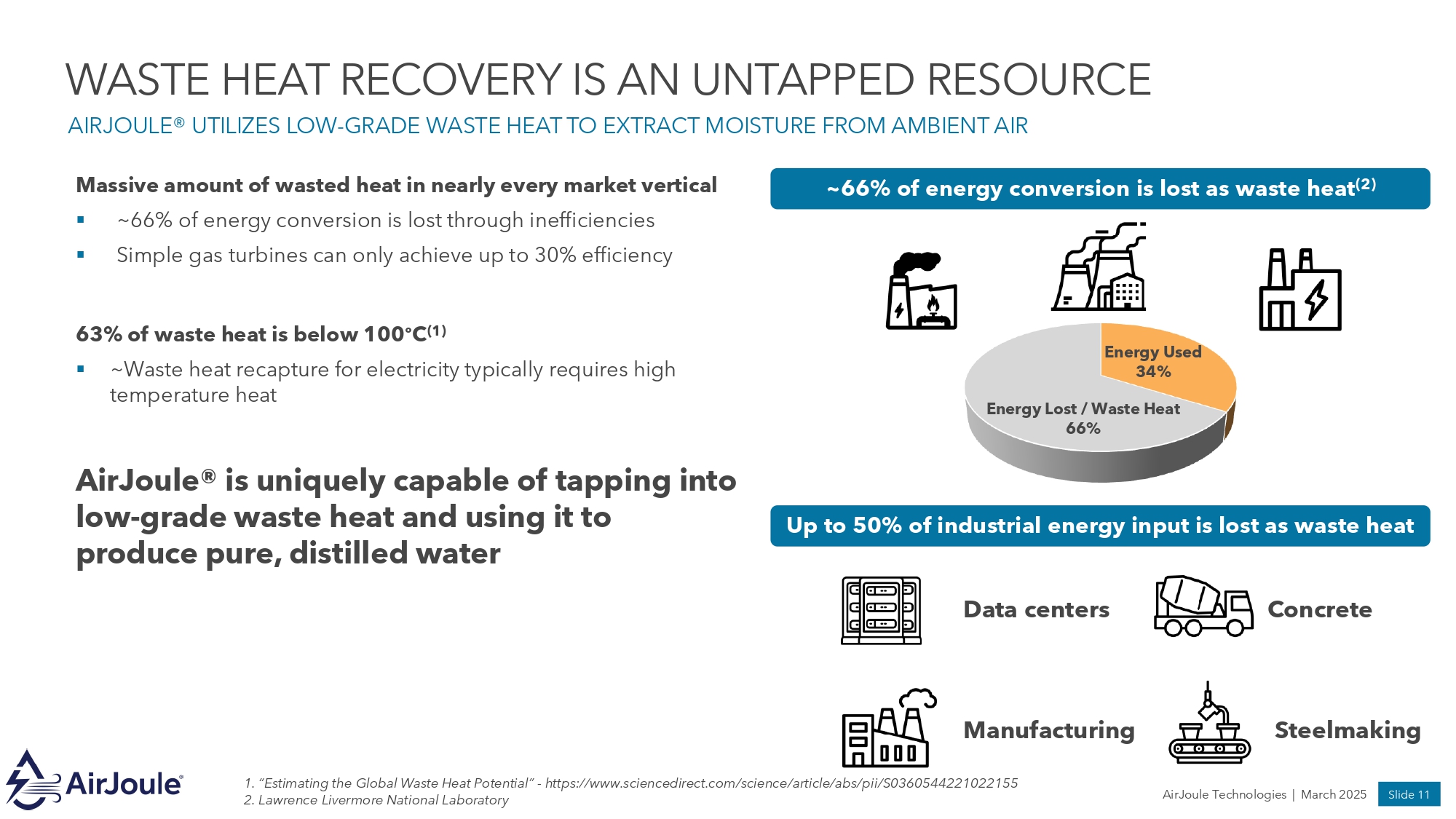 Slide 10 AirJoule Technologies | March 2025 MARKET OPPORTUNITIES AIRJOULE’S SUPERIOR PERFORMANCE UNLOCKS A VAST ARRAY OF MARKET OPPORTUNITIES (ESTIMATED AT $450 BILLION) Heating, Ventilation, and Air Conditioning ~$350 billion market • Air conditioning is responsible for ~10% of global electricity consumption, with demand expected to triple by 2050 (4) • Conventional air conditioners remove moisture by using refrigerants to cool below the dew point and condense moisture, an outdated and inefficient process • AirJoule® more efficiently removes moisture from air, which can reduce energy requirements for air conditioning by up to 50% • AirJoule Technologies is collaborating with Carrier to integrate AirJoule® into HVAC systems . Data Center Waste Heat & Cooling ~$20 billion market • All power that goes into a data center is converted to heat and must be cooled • Data centers have increasingly shifted away from low - cost evaporative cooling technologies due to constraints on water availability • AirJoule® utilizes low - grade waste heat to produce distilled water, enabling a refreshed look at energy - efficient evaporative cooling • Data center industry is expected to grow by 15 - 25% through 2030, with significant expansion in water - scarce regions (Arizona, Texas, etc) (1) Distributed Water Generation Emerging market • AirJoule®’s superior energetics can improve water security by enabling off - grid water supply for governments, militaries, NGOs, and businesses • Water security is a key priority for Middle East governments, which currently rely on desalination and imports for most of their water supply • AirJoule Technologies’ international office is in the United Arab Emirates • In 2024, AirJoule Technologies signed an MOU to explore off - grid water generation for solar - powered hydrogen production Advanced Manufacturing ~$20 billion market • US manufacturing sector is growing in response to macroeconomic and policy drivers (onshoring of supply chain, domestic content requirements, government incentives, US trade policy, etc) • $ 114 billion has been spent on the construction of new manufacturing plants, with 60 % for semiconductor and batteries ( 2 ) • Tremendous waste heat resource (up to 50% of industrial energy input is lost as waste heat) (3) • Applications for AirJoule® include distilled water production / recapture, dehumidification Near term markets 1. Lawrence Berkeley National Laboratory – “2024 United States Data Center Energy Usage Report” (December 2024) 2. Grid Strategies – “Strategic Industries Surging: Driving US Power Demand” (December 2024) 3. U.S. Department of Energy – Waste Heat Recovery Basics 4. Rocky Mountain Institute – “Solving the Global Cooling Challenge” (2018) Longer term markets