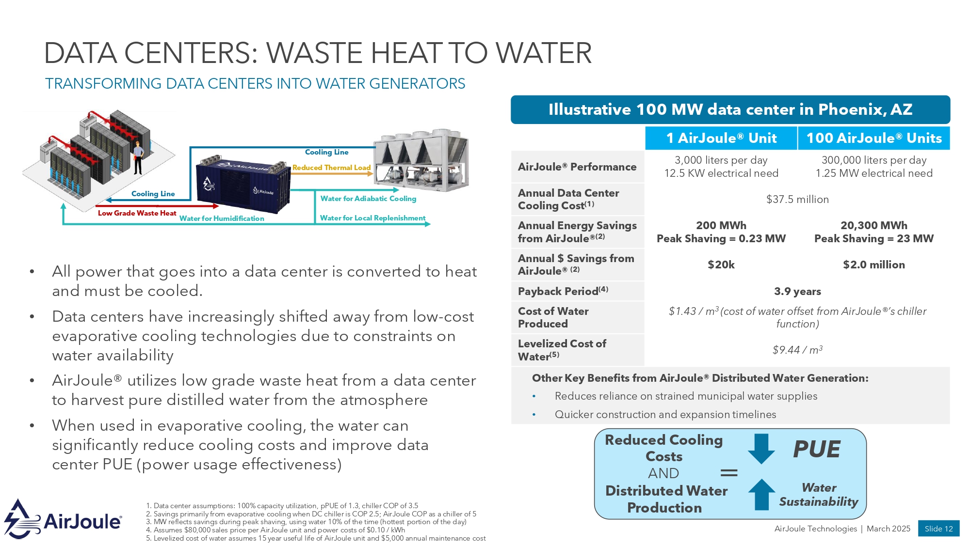Slide 11 AirJoule Technologies | March 2025 WASTE HEAT RECOVERY IS AN UNTAPPED RESOURCE AIRJOULE® UTILIZES LOW - GRADE WASTE HEAT TO EXTRACT MOISTURE FROM AMBIENT AIR 1. “Estimating the Global Waste Heat Potential” - https:// www.sciencedirect.com/science/article/abs/pii/S0360544221022155 2. Lawrence Livermore National Laboratory Massive amount of wasted heat in nearly every market vertical ▪ ~66% of energy conversion is lost through inefficiencies ▪ Simple gas turbines can only achieve up to 30% efficiency 63% of waste heat is below 100 Σ C (1) ▪ ~Waste heat recapture for electricity typically requires high temperature heat AirJoule® is uniquely capable of tapping into low - grade waste heat and using it to produce pure, distilled water Energy Used 34% Energy Lost / Waste Heat 66% ~66% of energy conversion is lost as waste heat (2) Up to 50% of industrial energy input is lost as waste heat Data centers Manufacturing Concrete Steelmaking