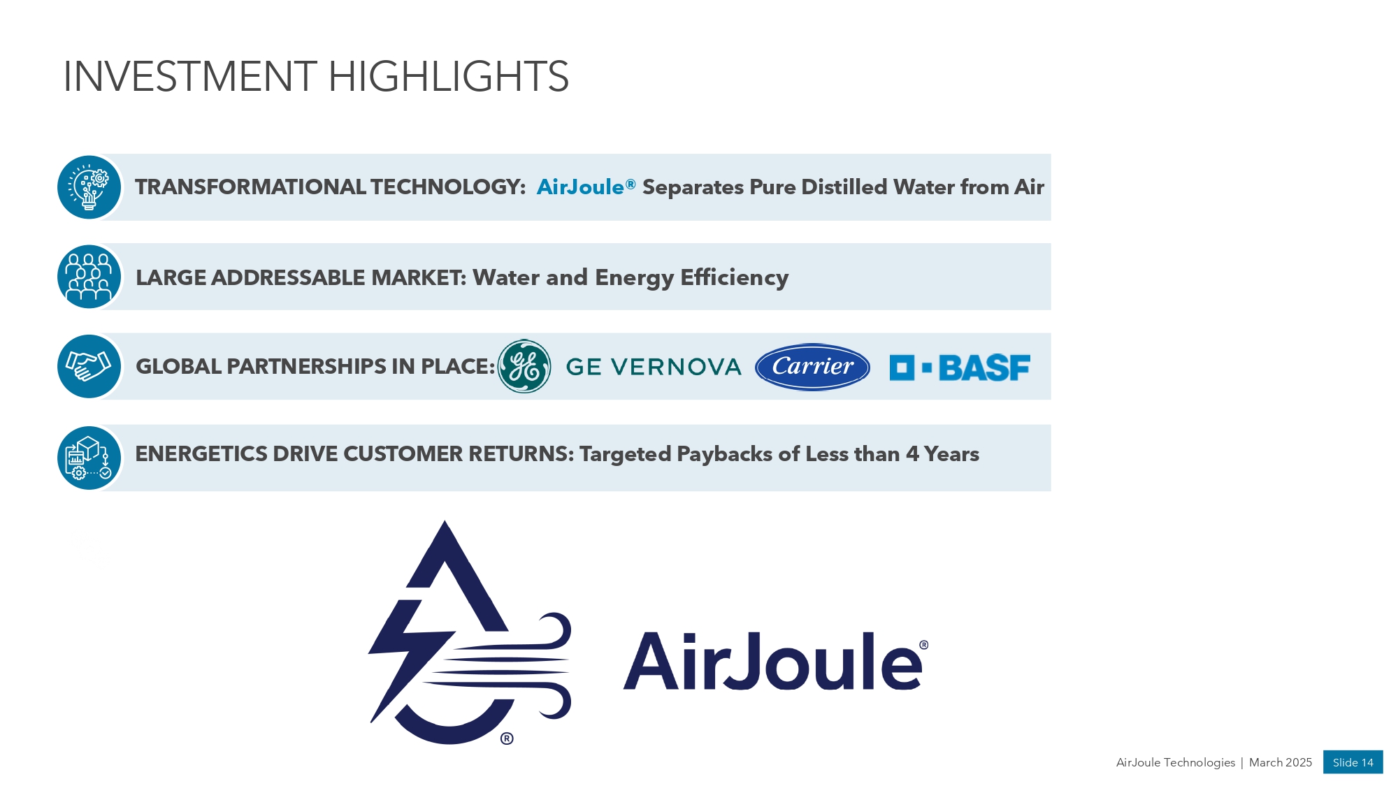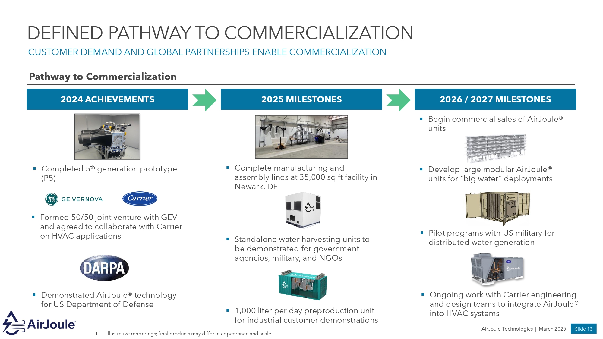 ▪ Ongoing work with Carrier engineering and design teams to integrate AirJoule® into HVAC systems AirJoule Technologies | March 2025 Slide 13 DEFINED PATHWAY TO COMMERCIALIZATION CUSTOMER DEMAND AND GLOBAL PARTNERSHIPS ENABLE COMMERCIALIZATION 2024 ACHIEVEMENTS 2025 MILESTONES 1. Illustrative renderings; final products may differ in appearance and scale 2026 / 2027 MILESTONES Pathway to Commercialization ▪ Complete manufacturing and assembly lines at 35,000 sq ft facility in Newark, DE ▪ Completed 5 th generation prototype (P5) ▪ Standalone water harvesting units to be demonstrated for government agencies, military, and NGOs ▪ Begin commercial sales of AirJoule® units ▪ Pilot programs with US military for distributed water generation ▪ Develop large modular AirJoule® units for “big water” deployments ▪ 1,000 liter per day preproduction unit for industrial customer demonstrations ▪ Demonstrated AirJoule® technology for US Department of Defense ▪ Formed 50/50 joint venture with GEV and agreed to collaborate with Carrier on HVAC applications