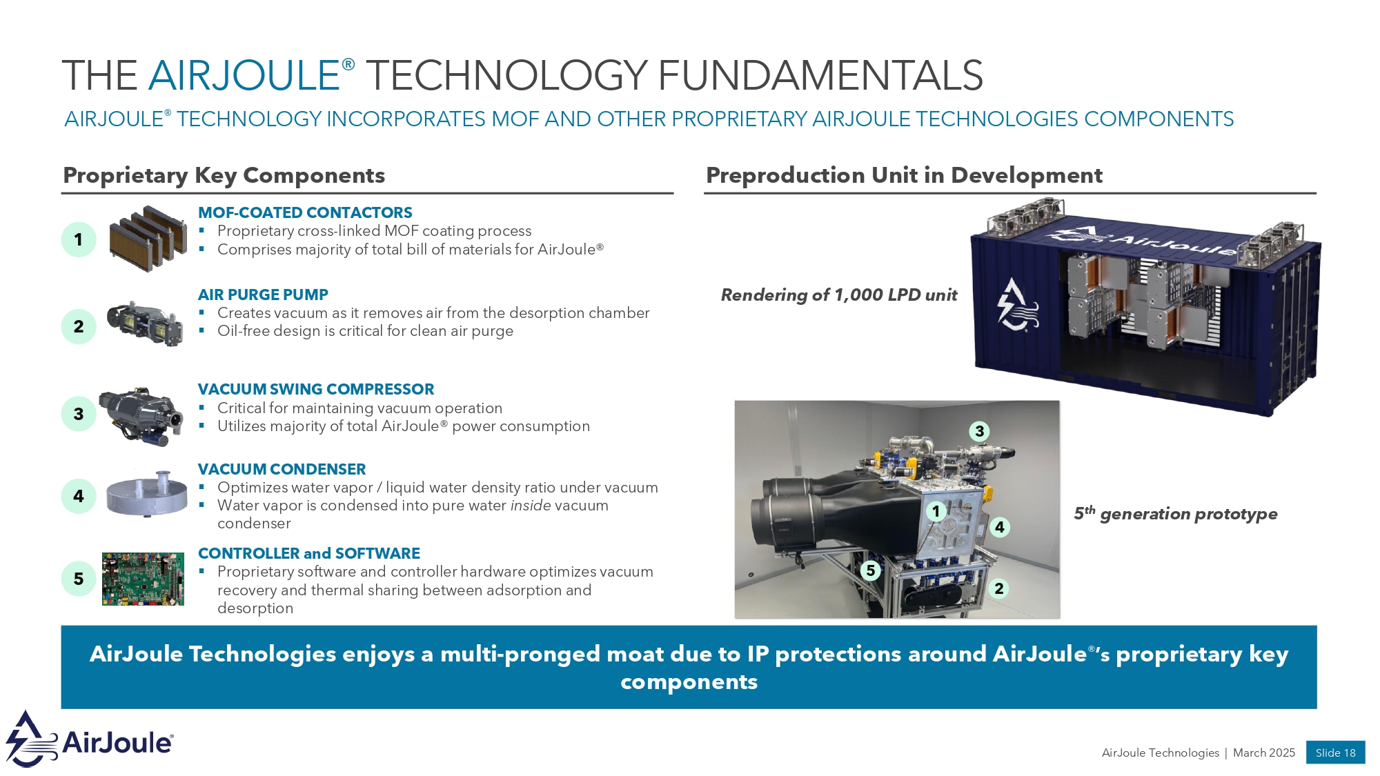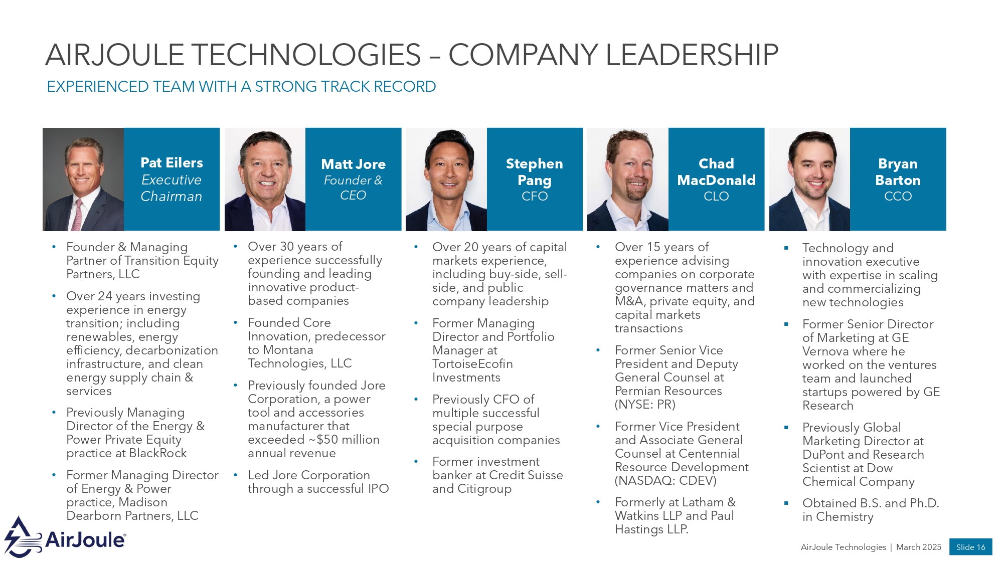 AIRJOULE TECHNOLOGIES – BOARD OF DIRECTORS ACCOMPLISHED BOARD WITH DIVERSE AREAS OF EXPERTISE Pat Eilers, Executive Chairman Founder & Managing Partner Transition Equity Partners Kyle Derham Partner, Rice Investment Group Stu Porter Founder & CEO Denham Capital Max Baucus Former US Senator & Ambassador to China Dr. Marwa Zaatari, Ph.D. Chief Science Officer D Zine Partners Paul Dabbar Co - founder & former CEO Bohr Quantum Technology Ajay Agrawal Chief Strategy Officer Carrier Global Corporation Matt Jore Founder & CEO AirJoule Technologies AirJoule Technologies | March 2025 Slide 17