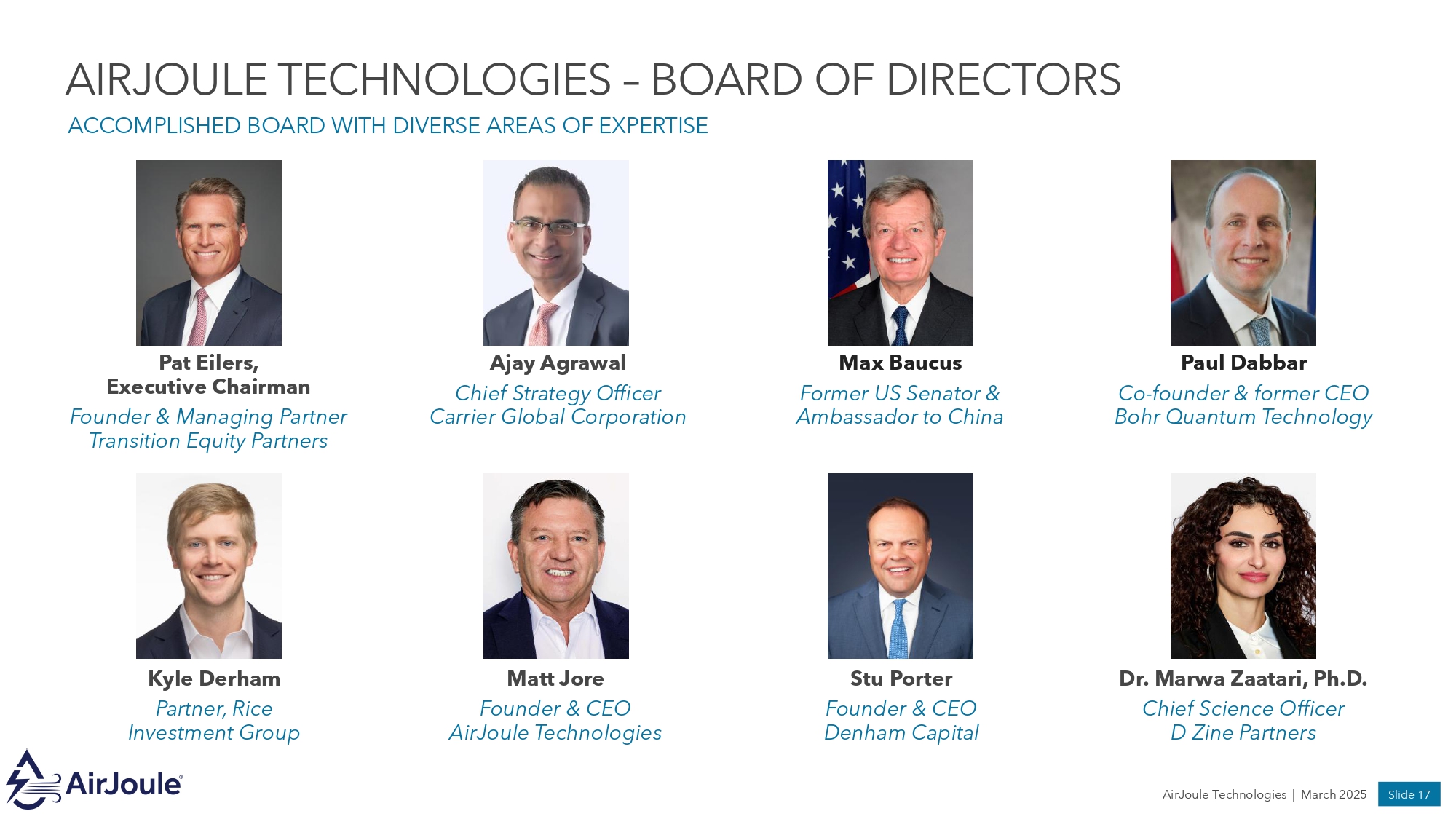 AIRJOULE TECHNOLOGIES – COMPANY LEADERSHIP EXPERIENCED TEAM WITH A STRONG TRACK RECORD • Over 30 years of experience successfully founding and leading innovative product - based companies • Founded Core Innovation, predecessor to Montana Technologies, LLC • Previously founded Jore Corporation, a power tool and accessories manufacturer that exceeded ~$50 million annual revenue • Led Jore Corporation through a successful IPO • Over 20 years of capital markets experience, including buy - side, sell - side, and public company leadership • Former Managing Director and Portfolio Manager at TortoiseEcofin Investments • Previously CFO of multiple successful special purpose acquisition companies • Former investment banker at Credit Suisse and Citigroup • Over 15 years of experience advising companies on corporate governance matters and M&A, private equity, and capital markets transactions • Former Senior Vice President and Deputy General Counsel at Permian Resources (NYSE: PR) • Former Vice President and Associate General Counsel at Centennial Resource Development (NASDAQ: CDEV) • Formerly at Latham & Watkins LLP and Paul Hastings LLP . Matt Jore Founder & CEO Stephen Pang CFO Chad MacDonald CLO • Founder & Managing Partner of Transition Equity Partners, LLC • Over 24 years investing experience in energy transition; including renewables, energy efficiency, decarbonization infrastructure, and clean energy supply chain & services • Previously Managing Director of the Energy & Power Private Equity practice at BlackRock • Former Managing Director of Energy & Power practice, Madison Dearborn Partners, LLC Pat Eilers Executive Chairman Bryan Barton CCO ▪ Technology and innovation executive with expertise in scaling and commercializing new technologies ▪ Former Senior Director of Marketing at GE Vernova where he worked on the ventures team and launched startups powered by GE Research ▪ Previously Global Marketing Director at DuPont and Research Scientist at Dow Chemical Company ▪ Obtained B.S. and Ph.D. in Chemistry AirJoule Technologies | March 2025 Slide 16