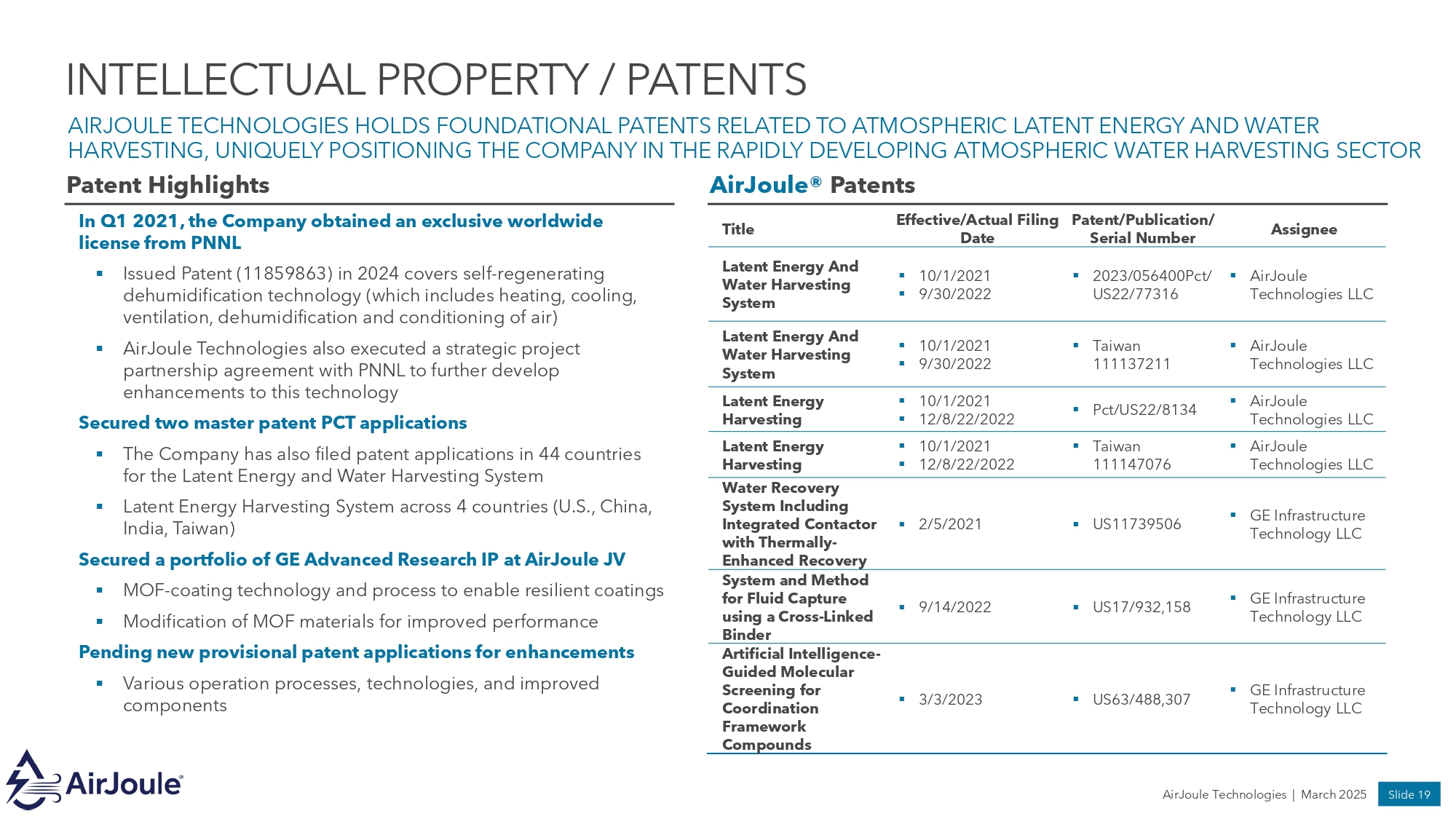 INTELLECTUAL PROPERTY / PATENTS AIRJOULE TECHNOLOGIES HOLDS FOUNDATIONAL PATENTS RELATED TO ATMOSPHERIC LATENT ENERGY AND WATER HARVESTING, UNIQUELY POSITIONING THE COMPANY IN THE RAPIDLY DEVELOPING ATMOSPHERIC WATER HARVESTING SECTOR Patent Highlights In Q1 2021, the Company obtained an exclusive worldwide license from PNNL ▪ Issued Patent (11859863) in 2024 covers self - regenerating dehumidification technology (which includes heating, cooling, ventilation, dehumidification and conditioning of air) ▪ AirJoule Technologies also executed a strategic project partnership agreement with PNNL to further develop enhancements to this technology Secured two master patent PCT applications ▪ The Company has also filed patent applications in 44 countries for the Latent Energy and Water Harvesting System ▪ Latent Energy Harvesting System across 4 countries (U.S., China, India, Taiwan) Secured a portfolio of GE Advanced Research IP at AirJoule JV ▪ MOF - coating technology and process to enable resilient coatings ▪ Modification of MOF materials for improved performance Pending new provisional patent applications for enhancements ▪ Various operation processes, technologies, and improved components AirJoule® Patents Assignee Patent/Publication/ Serial Number Effective/Actual Filing Date Title ▪ AirJoule Technologies LLC ▪ 2023/056400Pct/ US22/77316 ▪ 10/1/2021 ▪ 9/30/2022 Latent Energy And Water Harvesting System ▪ AirJoule Technologies LLC ▪ Taiwan 111137211 ▪ 10/1/2021 ▪ 9/30/2022 Latent Energy And Water Harvesting System ▪ AirJoule Technologies LLC ▪ Pct/US22/8134 ▪ 10/1/2021 ▪ 12/8/22/2022 Latent Energy Harvesting ▪ AirJoule Technologies LLC ▪ Taiwan 111147076 ▪ 10/1/2021 ▪ 12/8/22/2022 Latent Energy Harvesting ▪ GE Infrastructure Technology LLC ▪ US11739506 ▪ 2/5/2021 Water Recovery System Including Integrated Contactor with Thermally - Enhanced Recovery ▪ GE Infrastructure Technology LLC ▪ US17/932,158 ▪ 9/14/2022 System and Method for Fluid Capture using a Cross - Linked Binder ▪ GE Infrastructure Technology LLC ▪ US63/488,307 ▪ 3/3/2023 Artificial Intelligence - Guided Molecular Screening for Coordination Framework Compounds AirJoule Technologies | March 2025 Slide 19