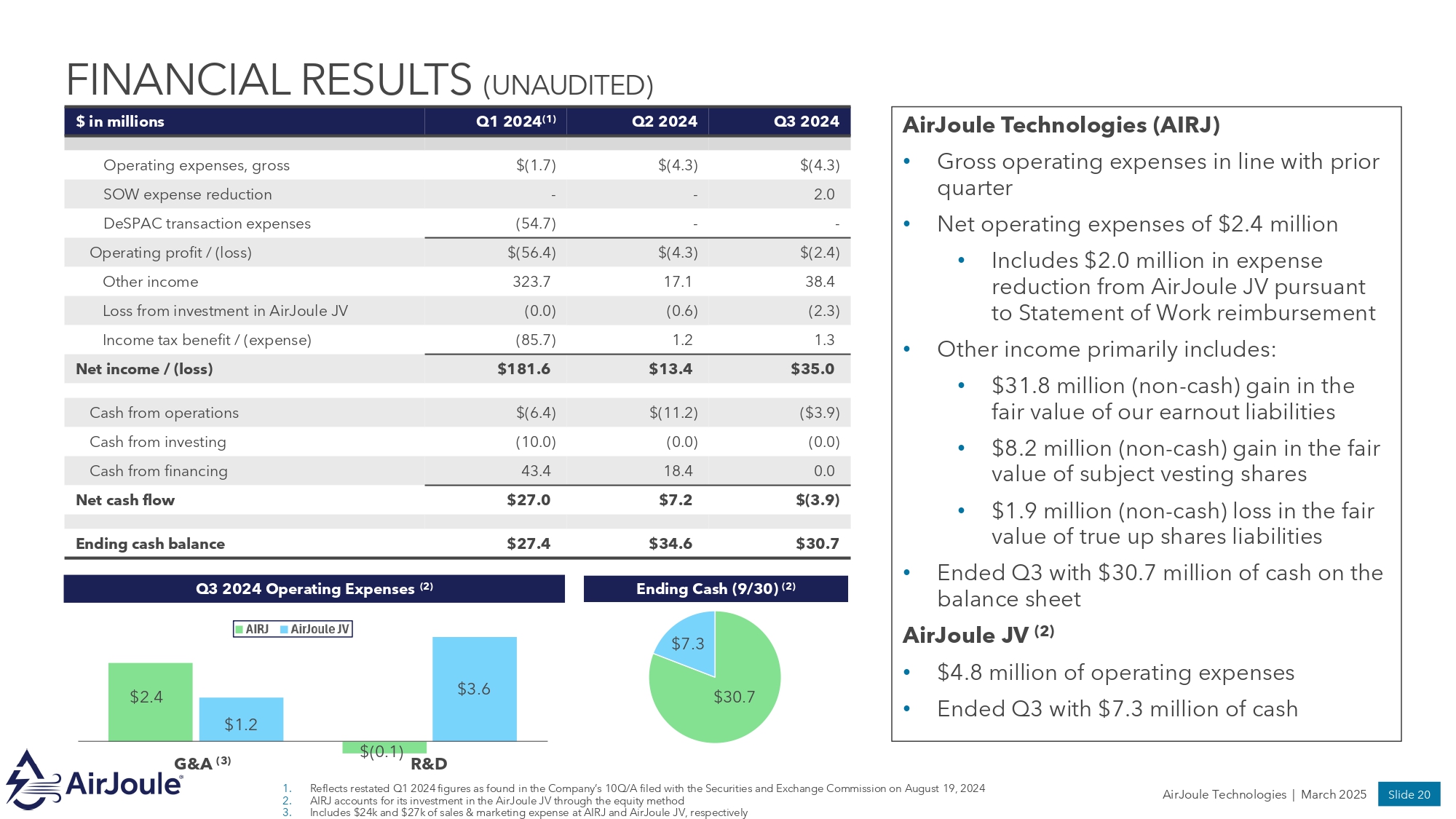 Slide 20 AirJoule Technologies | March 2025 FINANCIAL RESULTS (UNAUDITED) Q3 2024 Q2 2024 Q1 2024 (1) $ in millions $(4.3) $(4.3) $(1.7) Operating expenses, gross 2.0 - - SOW expense reduction - - (54.7) DeSPAC transaction expenses $(2.4) $(4.3) $(56.4) Operating profit / (loss) 38.4 17.1 323.7 Other income (2.3) (0.6) (0.0) Loss from investment in AirJoule JV 1.3 1.2 (85.7) Income tax benefit / (expense) $35.0 $13.4 $181.6 Net income / (loss) ($3.9) $(11.2) $(6.4) Cash from operations (0.0) (0.0) (10.0) Cash from investing 0.0 18.4 43.4 Cash from financing $(3.9) $7.2 $27.0 Net cash flow $30.7 $34.6 $27.4 Ending cash balance 1. Reflects restated Q1 2024 figures as found in the Company’s 10Q/A filed with the Securities and Exchange Commission on August 19, 2024 2. AIRJ accounts for its investment in the AirJoule JV through the equity method 3. Includes $24k and $27k of sales & marketing expense at AIRJ and AirJoule JV, respectively AirJoule Technologies (AIRJ) • Gross operating expenses in line with prior quarter • Net operating expenses of $2.4 million • Includes $2.0 million in expense reduction from AirJoule JV pursuant to Statement of Work reimbursement • Other income primarily includes: • $31.8 million (non - cash) gain in the fair value of our earnout liabilities • $8.2 million (non - cash) gain in the fair value of subject vesting shares • $1.9 million (non - cash) loss in the fair value of true up shares liabilities • Ended Q3 with $30.7 million of cash on the balance sheet AirJoule JV (2) • $4.8 million of operating expenses • Ended Q3 with $7.3 million of cash G&A (3) $2.4 $1.2 $3.6 $(0.1) R&D Q3 2024 Operating Expenses (2) Ending Cash (9/30) (2) $30.7 $7.3