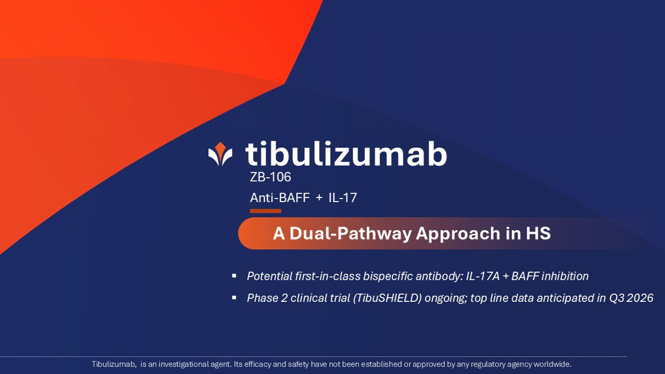 ©2025 Zura Bio Ltd. A Dual - Pathway Approach in HS tibulizumab ZB - 106 Anti - BAFF + IL - 17 ▪ Potential first - in - class bispecific antibody: IL - 17A + BAFF inhibition ▪ Phase 2 clinical trial ( TibuSHIELD ) ongoing; top line data anticipated in Q3 2026 Tibulizumab, is an investigational agent. Its efficacy and safety have not been established or approved by any regulatory ag enc y worldwide.