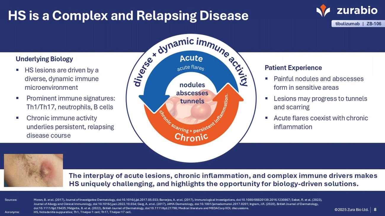 ©2025 Zura Bio Ltd. IL - 17A Promotes Neutrophil Infiltration and Activation in HS Lesions 11 Clinical studies demonstrate reductions in HS lesions with IL - 17A inhibitors; however, incomplete responses highlight the ongoing need for broader treatment strategies. IL - 17A FUELS HS INFLAMMATION ▪ Promotes activation of neutrophils, macrophages, and keratinocytes ▪ Inflammation and damage promote further IL - 17 production, driving a positive feedback loop → Acute lesions (abscesses & nodules) ( captured by AN count ) ▪ Drives tissue damage & chronic lesions → Draining tunnels ( reflected in IHS4 severity scores ) IL - 17A LOOP Sources: Gudjonsson, J.E. et al. (2020), JCI Insight, doi:10.1172/jci.insight.139930; Macchiarella, G. et al. (2023), Journal of Investigative Dermatology, doi:10.1016/j.jid.2022.08.051; Rumberger, B.E. et al. (2020), Inflammation Research, doi:10.1007/s00011 - 020 - 01381 - 7; Sabat, R. et al. (2023), Journal of Allergy and Clinical Immunology, doi:10.1016/j.jaci.2022.10 .034; Lima, A.L. et al. (2016), British Journal of Dermatology, doi:10.1111/bjd.14214; Kimball, A.B. et al. (2016), Journal of the American Academy of Dermatology, doi:10.1016/j.jaad.2016.08.012; Glatt, S. et al. (2021), Dermatol T her, doi:10.1007/s13555 - 021 - 00586 - 0. Acronyms: AN, abscess and nodule; DAMPs, damage - associated molecular patterns; HS, hidradenitis suppurativa; IHS4, International Hidradenitis Suppurativa Severity Score System; IL - 17, interleukin 17; PAMPs, pathogen - associated molecular patterns; Th17, T helper 17 cell. tibulizumab | ZB - 106