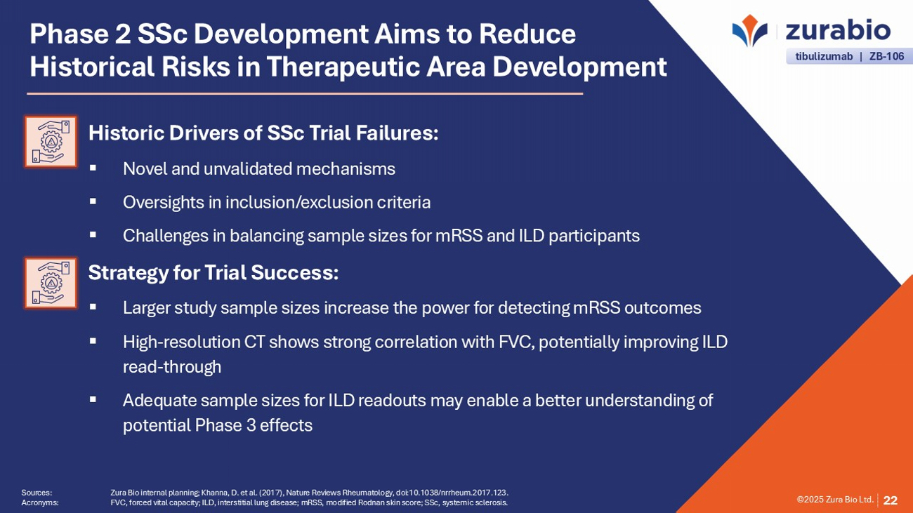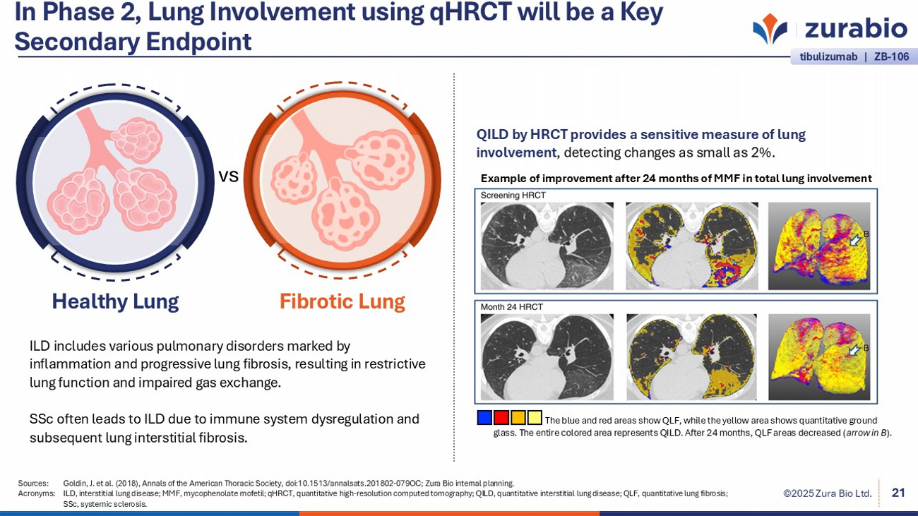 ©2025 Zura Bio Ltd. In Phase 2, Lung Involvement using qHRCT will be a Key Secondary Endpoint 21 Sources: Goldin, J. et al. (2018), Annals of the American Thoracic Society, doi:10.1513/annalsats.201802 - 079OC; Zura Bio interna l planning. Acronyms: ILD, interstitial lung disease; MMF, mycophenolate mofetil; qHRCT , quantitative high - resolution computed tomography; QILD, quantitative interstitial lung disease; QLF, quantitative lung fibrosi s; SSc, systemic sclerosis. ILD includes various pulmonary disorders marked by inflammation and progressive lung fibrosis, resulting in restrictive lung function and impaired gas exchange. SSc often leads to ILD due to immune system dysregulation and subsequent lung interstitial fibrosis. ​ vs Healthy Lung Fibrotic Lung QILD by HRCT provides a sensitive measure of lung involvement , detecting changes as small as 2%. Example of improvement after 24 months of MMF in total lung involvement The blue and red areas show QLF, while the yellow area shows quantitative ground glass. The entire colored area represents QILD. After 24 months, QLF areas decreased ( arrow in B ). tibulizumab | ZB - 106