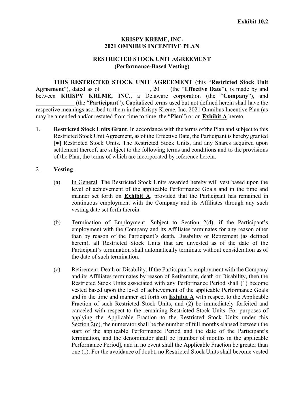 Exhibit 10.2 KRISPY KREME, INC. 2021 OMNIBUS INCENTIVE PLAN RESTRICTED STOCK UNIT AGREEMENT (Performance-Based Vesting) THIS RESTRICTED STOCK UNIT AGREEMENT (this “Restricted Stock Unit Agreement”), dated as of ________________, 20___ (the “Effective Date”), is made by and between KRISPY KREME, INC., a Delaware corporation (the “Company”), and _____________ (the “Participant”). Capitalized terms used but not defined herein shall have the respective meanings ascribed to them in the Krispy Kreme, Inc. 2021 Omnibus Incentive Plan (as may be amended and/or restated from time to time, the “Plan”) or on Exhibit A hereto. 1. Restricted Stock Units Grant. In accordance with the terms of the Plan and subject to this Restricted Stock Unit Agreement, as of the Effective Date, the Participant is hereby granted [●] Restricted Stock Units. The Restricted Stock Units, and any Shares acquired upon settlement thereof, are subject to the following terms and conditions and to the provisions of the Plan, the terms of which are incorporated by reference herein. 2. Vesting. (a) In General. The Restricted Stock Units awarded hereby will vest based upon the level of achievement of the applicable Performance Goals and in the time and manner set forth on Exhibit A, provided that the Participant has remained in continuous employment with the Company and its Affiliates through any such vesting date set forth therein. (b) Termination of Employment. Subject to Section 2(d), if the Participant’s employment with the Company and its Affiliates terminates for any reason other than by reason of the Participant’s death, Disability or Retirement (as defined herein), all Restricted Stock Units that are unvested as of the date of the Participant’s termination shall automatically terminate without consideration as of the date of such termination. (c) Retirement, Death or Disability. If the Participant’s employment with the Company and its Affiliates terminates by reason of Retirement, death or Disability, then the Restricted Stock Units associated with any Performance Period shall (1) become vested based upon the level of achievement of the applicable Performance Goals and in the time and manner set forth on Exhibit A with respect to the Applicable Fraction of such Restricted Stock Units, and (2) be immediately forfeited and canceled with respect to the remaining Restricted Stock Units. For purposes of applying the Applicable Fraction to the Restricted Stock Units under this Section 2(c), the numerator shall be the number of full months elapsed between the start of the applicable Performance Period and the date of the Participant’s termination, and the denominator shall be [number of months in the applicable Performance Period], and in no event shall the Applicable Fraction be greater than one (1). For the avoidance of doubt, no Restricted Stock Units shall become vested