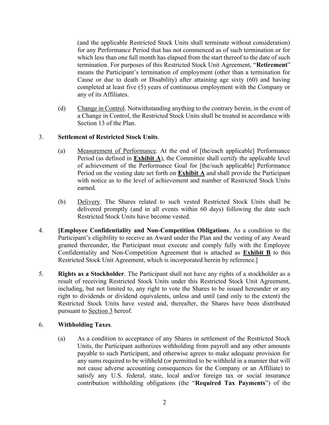 2 (and the applicable Restricted Stock Units shall terminate without consideration) for any Performance Period that has not commenced as of such termination or for which less than one full month has elapsed from the start thereof to the date of such termination. For purposes of this Restricted Stock Unit Agreement, “Retirement” means the Participant’s termination of employment (other than a termination for Cause or due to death or Disability) after attaining age sixty (60) and having completed at least five (5) years of continuous employment with the Company or any of its Affiliates. (d) Change in Control. Notwithstanding anything to the contrary herein, in the event of a Change in Control, the Restricted Stock Units shall be treated in accordance with Section 13 of the Plan. 3. Settlement of Restricted Stock Units. (a) Measurement of Performance. At the end of [the/each applicable] Performance Period (as defined in Exhibit A), the Committee shall certify the applicable level of achievement of the Performance Goal for [the/such applicable] Performance Period on the vesting date set forth on Exhibit A and shall provide the Participant with notice as to the level of achievement and number of Restricted Stock Units earned. (b) Delivery. The Shares related to such vested Restricted Stock Units shall be delivered promptly (and in all events within 60 days) following the date such Restricted Stock Units have become vested. 4. [Employee Confidentiality and Non-Competition Obligations. As a condition to the Participant’s eligibility to receive an Award under the Plan and the vesting of any Award granted thereunder, the Participant must execute and comply fully with the Employee Confidentiality and Non-Competition Agreement that is attached as Exhibit B to this Restricted Stock Unit Agreement, which is incorporated herein by reference.] 5. Rights as a Stockholder. The Participant shall not have any rights of a stockholder as a result of receiving Restricted Stock Units under this Restricted Stock Unit Agreement, including, but not limited to, any right to vote the Shares to be issued hereunder or any right to dividends or dividend equivalents, unless and until (and only to the extent) the Restricted Stock Units have vested and, thereafter, the Shares have been distributed pursuant to Section 3 hereof. 6. Withholding Taxes. (a) As a condition to acceptance of any Shares in settlement of the Restricted Stock Units, the Participant authorizes withholding from payroll and any other amounts payable to such Participant, and otherwise agrees to make adequate provision for any sums required to be withheld (or permitted to be withheld in a manner that will not cause adverse accounting consequences for the Company or an Affiliate) to satisfy any U.S. federal, state, local and/or foreign tax or social insurance contribution withholding obligations (the “Required Tax Payments”) of the