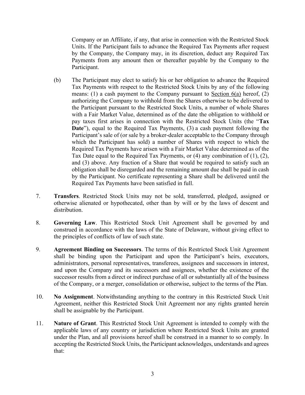 3 Company or an Affiliate, if any, that arise in connection with the Restricted Stock Units. If the Participant fails to advance the Required Tax Payments after request by the Company, the Company may, in its discretion, deduct any Required Tax Payments from any amount then or thereafter payable by the Company to the Participant. (b) The Participant may elect to satisfy his or her obligation to advance the Required Tax Payments with respect to the Restricted Stock Units by any of the following means: (1) a cash payment to the Company pursuant to Section 6(a) hereof, (2) authorizing the Company to withhold from the Shares otherwise to be delivered to the Participant pursuant to the Restricted Stock Units, a number of whole Shares with a Fair Market Value, determined as of the date the obligation to withhold or pay taxes first arises in connection with the Restricted Stock Units (the “Tax Date”), equal to the Required Tax Payments, (3) a cash payment following the Participant’s sale of (or sale by a broker-dealer acceptable to the Company through which the Participant has sold) a number of Shares with respect to which the Required Tax Payments have arisen with a Fair Market Value determined as of the Tax Date equal to the Required Tax Payments, or (4) any combination of (1), (2), and (3) above. Any fraction of a Share that would be required to satisfy such an obligation shall be disregarded and the remaining amount due shall be paid in cash by the Participant. No certificate representing a Share shall be delivered until the Required Tax Payments have been satisfied in full. 7. Transfers. Restricted Stock Units may not be sold, transferred, pledged, assigned or otherwise alienated or hypothecated, other than by will or by the laws of descent and distribution. 8. Governing Law. This Restricted Stock Unit Agreement shall be governed by and construed in accordance with the laws of the State of Delaware, without giving effect to the principles of conflicts of law of such state. 9. Agreement Binding on Successors. The terms of this Restricted Stock Unit Agreement shall be binding upon the Participant and upon the Participant’s heirs, executors, administrators, personal representatives, transferees, assignees and successors in interest, and upon the Company and its successors and assignees, whether the existence of the successor results from a direct or indirect purchase of all or substantially all of the business of the Company, or a merger, consolidation or otherwise, subject to the terms of the Plan. 10. No Assignment. Notwithstanding anything to the contrary in this Restricted Stock Unit Agreement, neither this Restricted Stock Unit Agreement nor any rights granted herein shall be assignable by the Participant. 11. Nature of Grant. This Restricted Stock Unit Agreement is intended to comply with the applicable laws of any country or jurisdiction where Restricted Stock Units are granted under the Plan, and all provisions hereof shall be construed in a manner to so comply. In accepting the Restricted Stock Units, the Participant acknowledges, understands and agrees that: