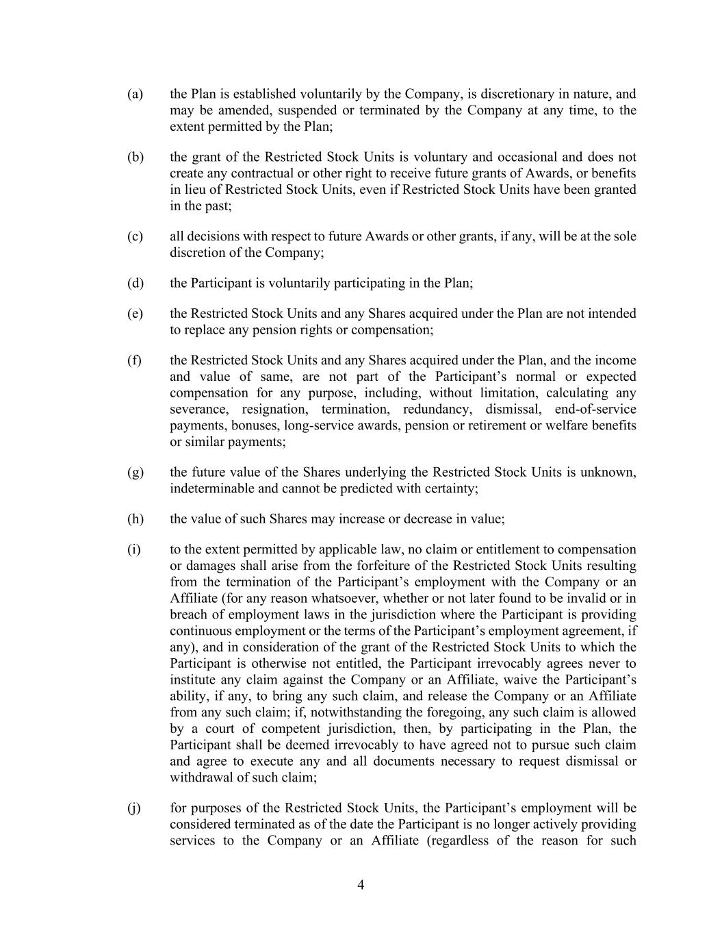 4 (a) the Plan is established voluntarily by the Company, is discretionary in nature, and may be amended, suspended or terminated by the Company at any time, to the extent permitted by the Plan; (b) the grant of the Restricted Stock Units is voluntary and occasional and does not create any contractual or other right to receive future grants of Awards, or benefits in lieu of Restricted Stock Units, even if Restricted Stock Units have been granted in the past; (c) all decisions with respect to future Awards or other grants, if any, will be at the sole discretion of the Company; (d) the Participant is voluntarily participating in the Plan; (e) the Restricted Stock Units and any Shares acquired under the Plan are not intended to replace any pension rights or compensation; (f) the Restricted Stock Units and any Shares acquired under the Plan, and the income and value of same, are not part of the Participant’s normal or expected compensation for any purpose, including, without limitation, calculating any severance, resignation, termination, redundancy, dismissal, end-of-service payments, bonuses, long-service awards, pension or retirement or welfare benefits or similar payments; (g) the future value of the Shares underlying the Restricted Stock Units is unknown, indeterminable and cannot be predicted with certainty; (h) the value of such Shares may increase or decrease in value; (i) to the extent permitted by applicable law, no claim or entitlement to compensation or damages shall arise from the forfeiture of the Restricted Stock Units resulting from the termination of the Participant’s employment with the Company or an Affiliate (for any reason whatsoever, whether or not later found to be invalid or in breach of employment laws in the jurisdiction where the Participant is providing continuous employment or the terms of the Participant’s employment agreement, if any), and in consideration of the grant of the Restricted Stock Units to which the Participant is otherwise not entitled, the Participant irrevocably agrees never to institute any claim against the Company or an Affiliate, waive the Participant’s ability, if any, to bring any such claim, and release the Company or an Affiliate from any such claim; if, notwithstanding the foregoing, any such claim is allowed by a court of competent jurisdiction, then, by participating in the Plan, the Participant shall be deemed irrevocably to have agreed not to pursue such claim and agree to execute any and all documents necessary to request dismissal or withdrawal of such claim; (j) for purposes of the Restricted Stock Units, the Participant’s employment will be considered terminated as of the date the Participant is no longer actively providing services to the Company or an Affiliate (regardless of the reason for such