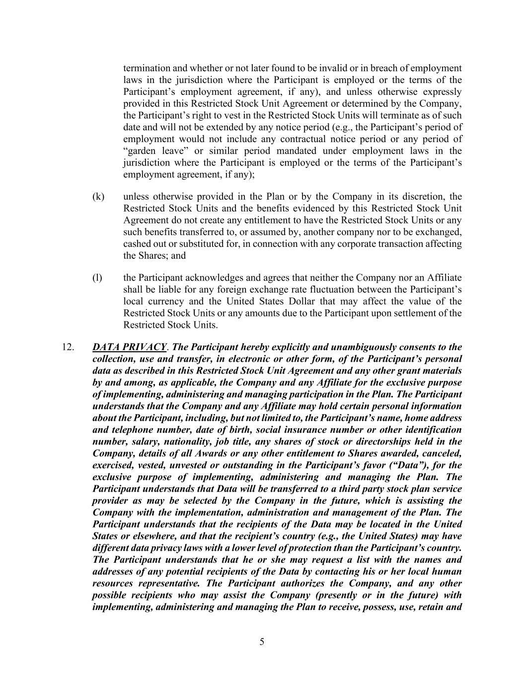 5 termination and whether or not later found to be invalid or in breach of employment laws in the jurisdiction where the Participant is employed or the terms of the Participant’s employment agreement, if any), and unless otherwise expressly provided in this Restricted Stock Unit Agreement or determined by the Company, the Participant’s right to vest in the Restricted Stock Units will terminate as of such date and will not be extended by any notice period (e.g., the Participant’s period of employment would not include any contractual notice period or any period of “garden leave” or similar period mandated under employment laws in the jurisdiction where the Participant is employed or the terms of the Participant’s employment agreement, if any); (k) unless otherwise provided in the Plan or by the Company in its discretion, the Restricted Stock Units and the benefits evidenced by this Restricted Stock Unit Agreement do not create any entitlement to have the Restricted Stock Units or any such benefits transferred to, or assumed by, another company nor to be exchanged, cashed out or substituted for, in connection with any corporate transaction affecting the Shares; and (l) the Participant acknowledges and agrees that neither the Company nor an Affiliate shall be liable for any foreign exchange rate fluctuation between the Participant’s local currency and the United States Dollar that may affect the value of the Restricted Stock Units or any amounts due to the Participant upon settlement of the Restricted Stock Units. 12. DATA PRIVACY. The Participant hereby explicitly and unambiguously consents to the collection, use and transfer, in electronic or other form, of the Participant’s personal data as described in this Restricted Stock Unit Agreement and any other grant materials by and among, as applicable, the Company and any Affiliate for the exclusive purpose of implementing, administering and managing participation in the Plan. The Participant understands that the Company and any Affiliate may hold certain personal information about the Participant, including, but not limited to, the Participant’s name, home address and telephone number, date of birth, social insurance number or other identification number, salary, nationality, job title, any shares of stock or directorships held in the Company, details of all Awards or any other entitlement to Shares awarded, canceled, exercised, vested, unvested or outstanding in the Participant’s favor (“Data”), for the exclusive purpose of implementing, administering and managing the Plan. The Participant understands that Data will be transferred to a third party stock plan service provider as may be selected by the Company in the future, which is assisting the Company with the implementation, administration and management of the Plan. The Participant understands that the recipients of the Data may be located in the United States or elsewhere, and that the recipient’s country (e.g., the United States) may have different data privacy laws with a lower level of protection than the Participant’s country. The Participant understands that he or she may request a list with the names and addresses of any potential recipients of the Data by contacting his or her local human resources representative. The Participant authorizes the Company, and any other possible recipients who may assist the Company (presently or in the future) with implementing, administering and managing the Plan to receive, possess, use, retain and