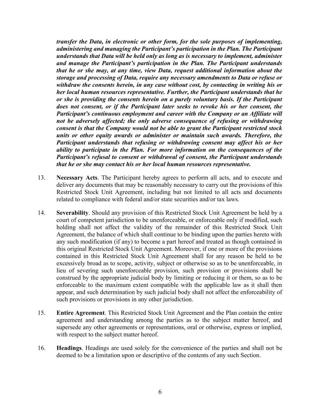 6 transfer the Data, in electronic or other form, for the sole purposes of implementing, administering and managing the Participant’s participation in the Plan. The Participant understands that Data will be held only as long as is necessary to implement, administer and manage the Participant’s participation in the Plan. The Participant understands that he or she may, at any time, view Data, request additional information about the storage and processing of Data, require any necessary amendments to Data or refuse or withdraw the consents herein, in any case without cost, by contacting in writing his or her local human resources representative. Further, the Participant understands that he or she is providing the consents herein on a purely voluntary basis. If the Participant does not consent, or if the Participant later seeks to revoke his or her consent, the Participant’s continuous employment and career with the Company or an Affiliate will not be adversely affected; the only adverse consequence of refusing or withdrawing consent is that the Company would not be able to grant the Participant restricted stock units or other equity awards or administer or maintain such awards. Therefore, the Participant understands that refusing or withdrawing consent may affect his or her ability to participate in the Plan. For more information on the consequences of the Participant’s refusal to consent or withdrawal of consent, the Participant understands that he or she may contact his or her local human resources representative. 13. Necessary Acts. The Participant hereby agrees to perform all acts, and to execute and deliver any documents that may be reasonably necessary to carry out the provisions of this Restricted Stock Unit Agreement, including but not limited to all acts and documents related to compliance with federal and/or state securities and/or tax laws. 14. Severability. Should any provision of this Restricted Stock Unit Agreement be held by a court of competent jurisdiction to be unenforceable, or enforceable only if modified, such holding shall not affect the validity of the remainder of this Restricted Stock Unit Agreement, the balance of which shall continue to be binding upon the parties hereto with any such modification (if any) to become a part hereof and treated as though contained in this original Restricted Stock Unit Agreement. Moreover, if one or more of the provisions contained in this Restricted Stock Unit Agreement shall for any reason be held to be excessively broad as to scope, activity, subject or otherwise so as to be unenforceable, in lieu of severing such unenforceable provision, such provision or provisions shall be construed by the appropriate judicial body by limiting or reducing it or them, so as to be enforceable to the maximum extent compatible with the applicable law as it shall then appear, and such determination by such judicial body shall not affect the enforceability of such provisions or provisions in any other jurisdiction. 15. Entire Agreement. This Restricted Stock Unit Agreement and the Plan contain the entire agreement and understanding among the parties as to the subject matter hereof, and supersede any other agreements or representations, oral or otherwise, express or implied, with respect to the subject matter hereof. 16. Headings. Headings are used solely for the convenience of the parties and shall not be deemed to be a limitation upon or descriptive of the contents of any such Section.