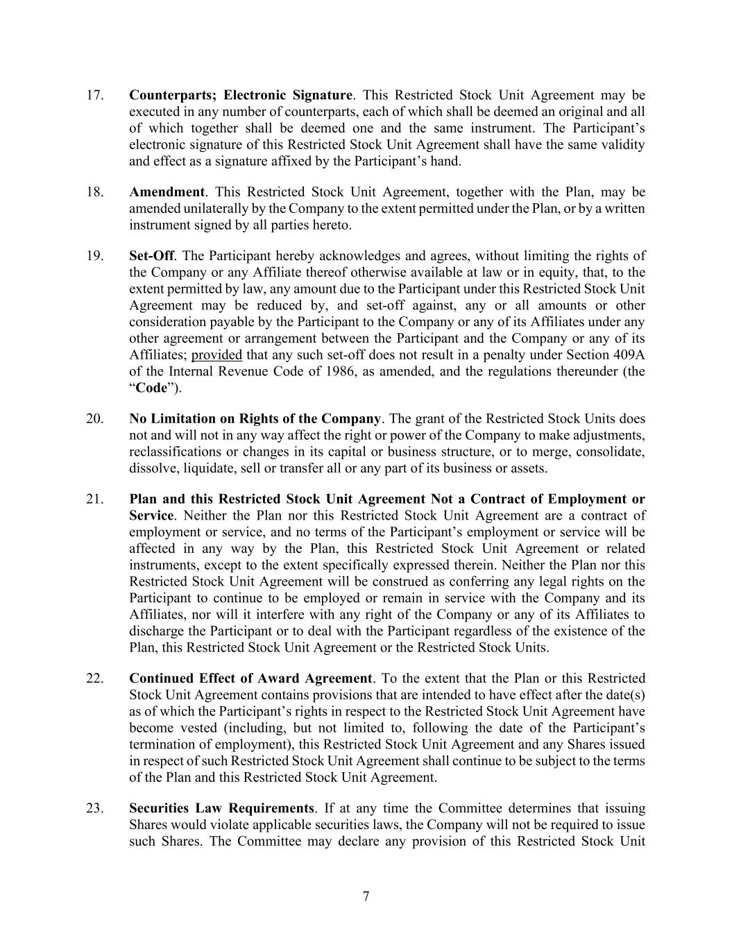 7 17. Counterparts; Electronic Signature. This Restricted Stock Unit Agreement may be executed in any number of counterparts, each of which shall be deemed an original and all of which together shall be deemed one and the same instrument. The Participant’s electronic signature of this Restricted Stock Unit Agreement shall have the same validity and effect as a signature affixed by the Participant’s hand. 18. Amendment. This Restricted Stock Unit Agreement, together with the Plan, may be amended unilaterally by the Company to the extent permitted under the Plan, or by a written instrument signed by all parties hereto. 19. Set-Off. The Participant hereby acknowledges and agrees, without limiting the rights of the Company or any Affiliate thereof otherwise available at law or in equity, that, to the extent permitted by law, any amount due to the Participant under this Restricted Stock Unit Agreement may be reduced by, and set-off against, any or all amounts or other consideration payable by the Participant to the Company or any of its Affiliates under any other agreement or arrangement between the Participant and the Company or any of its Affiliates; provided that any such set-off does not result in a penalty under Section 409A of the Internal Revenue Code of 1986, as amended, and the regulations thereunder (the “Code”). 20. No Limitation on Rights of the Company. The grant of the Restricted Stock Units does not and will not in any way affect the right or power of the Company to make adjustments, reclassifications or changes in its capital or business structure, or to merge, consolidate, dissolve, liquidate, sell or transfer all or any part of its business or assets. 21. Plan and this Restricted Stock Unit Agreement Not a Contract of Employment or Service. Neither the Plan nor this Restricted Stock Unit Agreement are a contract of employment or service, and no terms of the Participant’s employment or service will be affected in any way by the Plan, this Restricted Stock Unit Agreement or related instruments, except to the extent specifically expressed therein. Neither the Plan nor this Restricted Stock Unit Agreement will be construed as conferring any legal rights on the Participant to continue to be employed or remain in service with the Company and its Affiliates, nor will it interfere with any right of the Company or any of its Affiliates to discharge the Participant or to deal with the Participant regardless of the existence of the Plan, this Restricted Stock Unit Agreement or the Restricted Stock Units. 22. Continued Effect of Award Agreement. To the extent that the Plan or this Restricted Stock Unit Agreement contains provisions that are intended to have effect after the date(s) as of which the Participant’s rights in respect to the Restricted Stock Unit Agreement have become vested (including, but not limited to, following the date of the Participant’s termination of employment), this Restricted Stock Unit Agreement and any Shares issued in respect of such Restricted Stock Unit Agreement shall continue to be subject to the terms of the Plan and this Restricted Stock Unit Agreement. 23. Securities Law Requirements. If at any time the Committee determines that issuing Shares would violate applicable securities laws, the Company will not be required to issue such Shares. The Committee may declare any provision of this Restricted Stock Unit