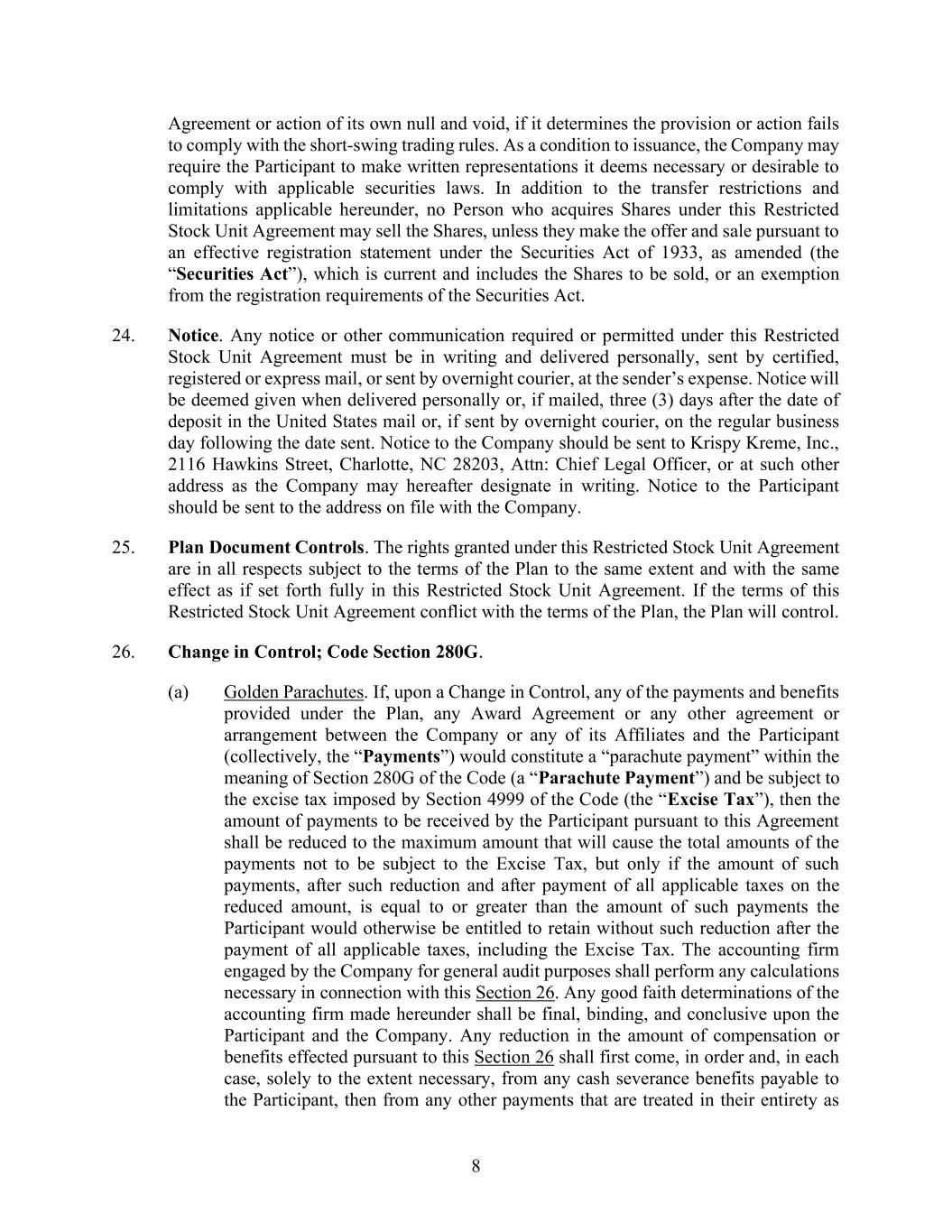 8 Agreement or action of its own null and void, if it determines the provision or action fails to comply with the short-swing trading rules. As a condition to issuance, the Company may require the Participant to make written representations it deems necessary or desirable to comply with applicable securities laws. In addition to the transfer restrictions and limitations applicable hereunder, no Person who acquires Shares under this Restricted Stock Unit Agreement may sell the Shares, unless they make the offer and sale pursuant to an effective registration statement under the Securities Act of 1933, as amended (the “Securities Act”), which is current and includes the Shares to be sold, or an exemption from the registration requirements of the Securities Act. 24. Notice. Any notice or other communication required or permitted under this Restricted Stock Unit Agreement must be in writing and delivered personally, sent by certified, registered or express mail, or sent by overnight courier, at the sender’s expense. Notice will be deemed given when delivered personally or, if mailed, three (3) days after the date of deposit in the United States mail or, if sent by overnight courier, on the regular business day following the date sent. Notice to the Company should be sent to Krispy Kreme, Inc., 2116 Hawkins Street, Charlotte, NC 28203, Attn: Chief Legal Officer, or at such other address as the Company may hereafter designate in writing. Notice to the Participant should be sent to the address on file with the Company. 25. Plan Document Controls. The rights granted under this Restricted Stock Unit Agreement are in all respects subject to the terms of the Plan to the same extent and with the same effect as if set forth fully in this Restricted Stock Unit Agreement. If the terms of this Restricted Stock Unit Agreement conflict with the terms of the Plan, the Plan will control. 26. Change in Control; Code Section 280G. (a) Golden Parachutes. If, upon a Change in Control, any of the payments and benefits provided under the Plan, any Award Agreement or any other agreement or arrangement between the Company or any of its Affiliates and the Participant (collectively, the “Payments”) would constitute a “parachute payment” within the meaning of Section 280G of the Code (a “Parachute Payment”) and be subject to the excise tax imposed by Section 4999 of the Code (the “Excise Tax”), then the amount of payments to be received by the Participant pursuant to this Agreement shall be reduced to the maximum amount that will cause the total amounts of the payments not to be subject to the Excise Tax, but only if the amount of such payments, after such reduction and after payment of all applicable taxes on the reduced amount, is equal to or greater than the amount of such payments the Participant would otherwise be entitled to retain without such reduction after the payment of all applicable taxes, including the Excise Tax. The accounting firm engaged by the Company for general audit purposes shall perform any calculations necessary in connection with this Section 26. Any good faith determinations of the accounting firm made hereunder shall be final, binding, and conclusive upon the Participant and the Company. Any reduction in the amount of compensation or benefits effected pursuant to this Section 26 shall first come, in order and, in each case, solely to the extent necessary, from any cash severance benefits payable to the Participant, then from any other payments that are treated in their entirety as