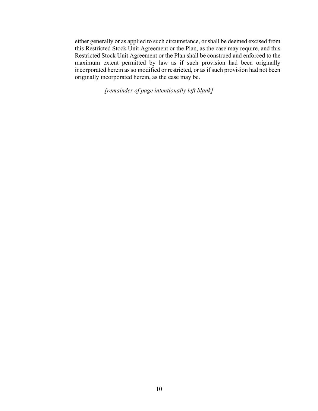 10 either generally or as applied to such circumstance, or shall be deemed excised from this Restricted Stock Unit Agreement or the Plan, as the case may require, and this Restricted Stock Unit Agreement or the Plan shall be construed and enforced to the maximum extent permitted by law as if such provision had been originally incorporated herein as so modified or restricted, or as if such provision had not been originally incorporated herein, as the case may be. [remainder of page intentionally left blank]