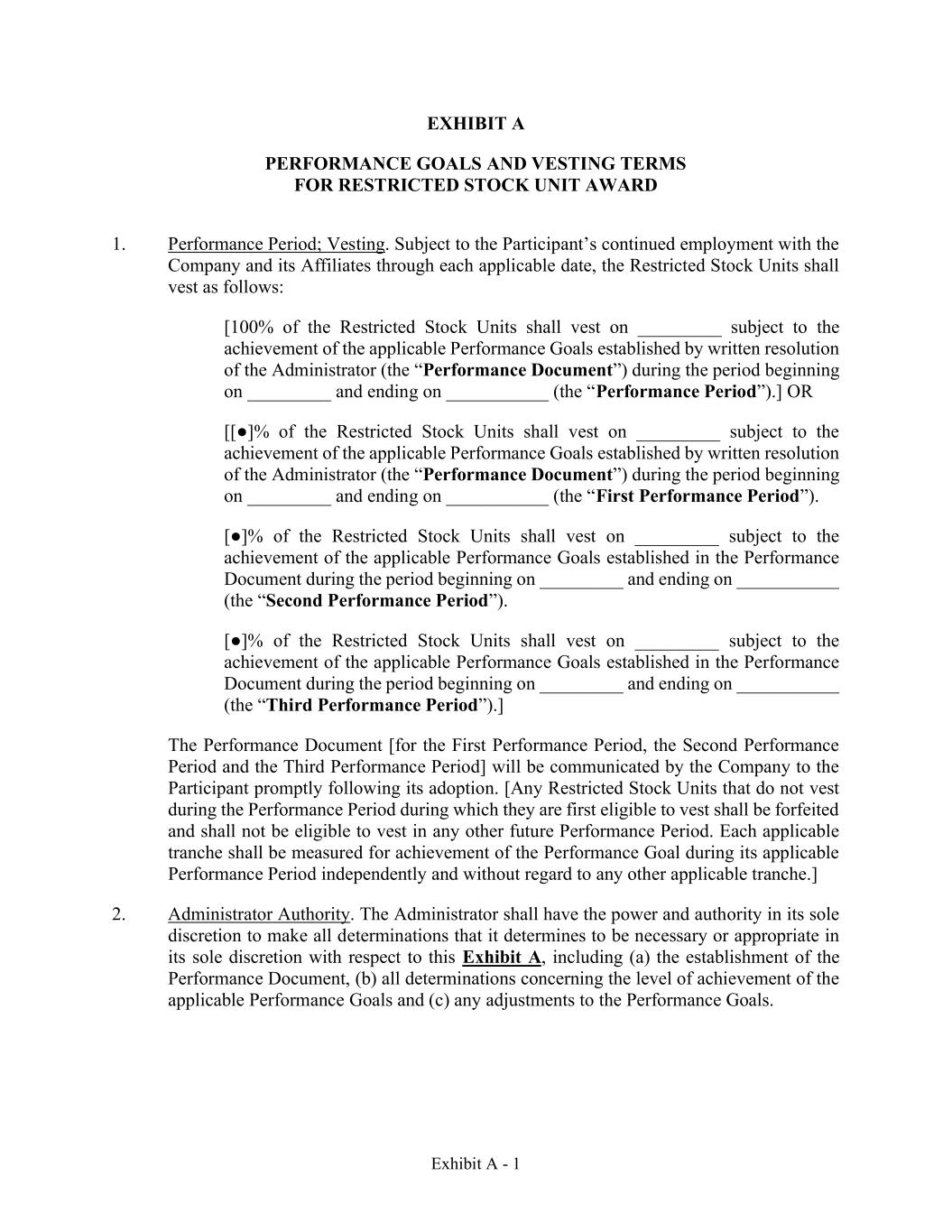 Exhibit A - 1 EXHIBIT A PERFORMANCE GOALS AND VESTING TERMS FOR RESTRICTED STOCK UNIT AWARD 1. Performance Period; Vesting. Subject to the Participant’s continued employment with the Company and its Affiliates through each applicable date, the Restricted Stock Units shall vest as follows: [100% of the Restricted Stock Units shall vest on _________ subject to the achievement of the applicable Performance Goals established by written resolution of the Administrator (the “Performance Document”) during the period beginning on _________ and ending on ___________ (the “Performance Period”).] OR [[●]% of the Restricted Stock Units shall vest on _________ subject to the achievement of the applicable Performance Goals established by written resolution of the Administrator (the “Performance Document”) during the period beginning on _________ and ending on ___________ (the “First Performance Period”). [●]% of the Restricted Stock Units shall vest on _________ subject to the achievement of the applicable Performance Goals established in the Performance Document during the period beginning on _________ and ending on ___________ (the “Second Performance Period”). [●]% of the Restricted Stock Units shall vest on _________ subject to the achievement of the applicable Performance Goals established in the Performance Document during the period beginning on _________ and ending on ___________ (the “Third Performance Period”).] The Performance Document [for the First Performance Period, the Second Performance Period and the Third Performance Period] will be communicated by the Company to the Participant promptly following its adoption. [Any Restricted Stock Units that do not vest during the Performance Period during which they are first eligible to vest shall be forfeited and shall not be eligible to vest in any other future Performance Period. Each applicable tranche shall be measured for achievement of the Performance Goal during its applicable Performance Period independently and without regard to any other applicable tranche.] 2. Administrator Authority. The Administrator shall have the power and authority in its sole discretion to make all determinations that it determines to be necessary or appropriate in its sole discretion with respect to this Exhibit A, including (a) the establishment of the Performance Document, (b) all determinations concerning the level of achievement of the applicable Performance Goals and (c) any adjustments to the Performance Goals.