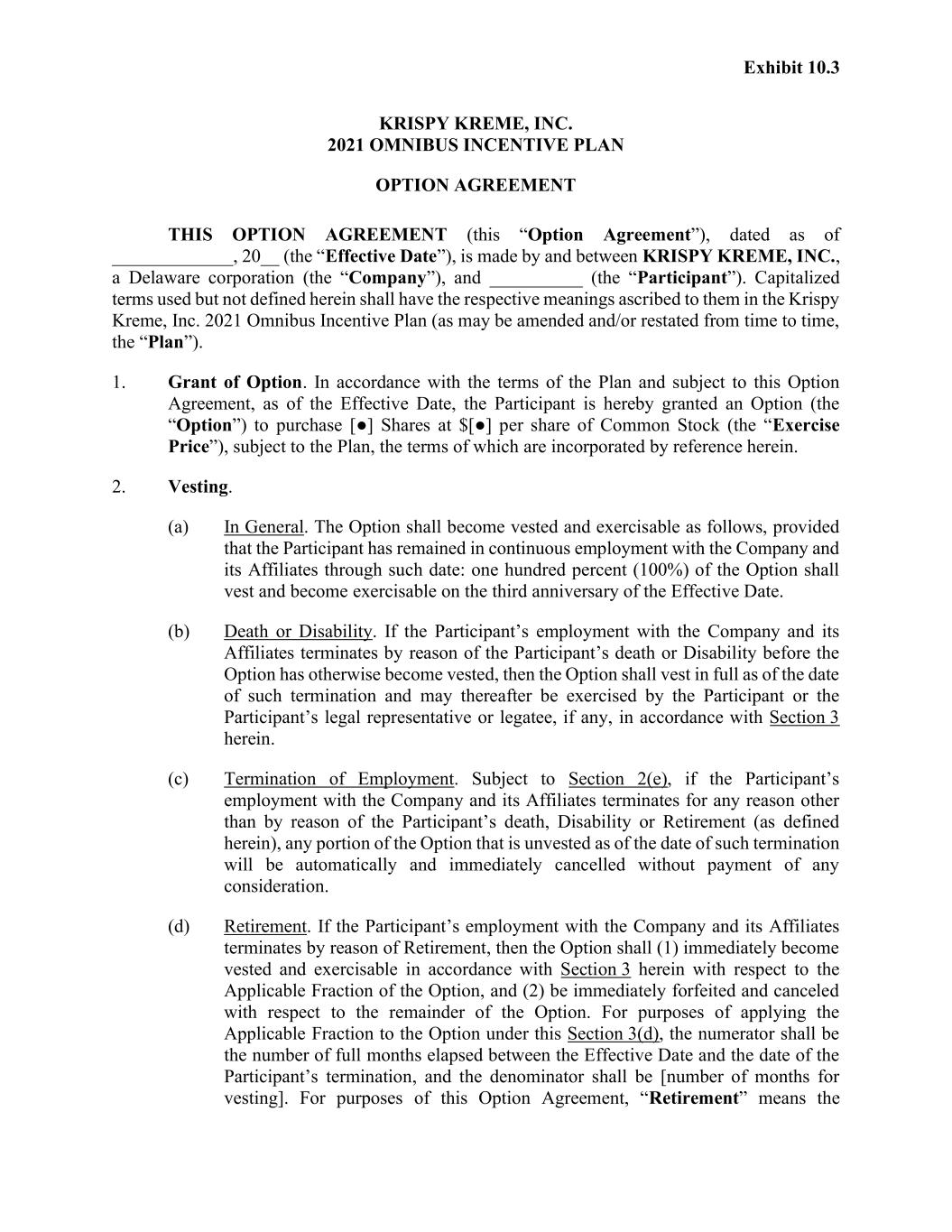 Exhibit 10.3 KRISPY KREME, INC. 2021 OMNIBUS INCENTIVE PLAN OPTION AGREEMENT THIS OPTION AGREEMENT (this “Option Agreement”), dated as of _____________, 20__ (the “Effective Date”), is made by and between KRISPY KREME, INC., a Delaware corporation (the “Company”), and __________ (the “Participant”). Capitalized terms used but not defined herein shall have the respective meanings ascribed to them in the Krispy Kreme, Inc. 2021 Omnibus Incentive Plan (as may be amended and/or restated from time to time, the “Plan”). 1. Grant of Option. In accordance with the terms of the Plan and subject to this Option Agreement, as of the Effective Date, the Participant is hereby granted an Option (the “Option”) to purchase [●] Shares at $[●] per share of Common Stock (the “Exercise Price”), subject to the Plan, the terms of which are incorporated by reference herein. 2. Vesting. (a) In General. The Option shall become vested and exercisable as follows, provided that the Participant has remained in continuous employment with the Company and its Affiliates through such date: one hundred percent (100%) of the Option shall vest and become exercisable on the third anniversary of the Effective Date. (b) Death or Disability. If the Participant’s employment with the Company and its Affiliates terminates by reason of the Participant’s death or Disability before the Option has otherwise become vested, then the Option shall vest in full as of the date of such termination and may thereafter be exercised by the Participant or the Participant’s legal representative or legatee, if any, in accordance with Section 3 herein. (c) Termination of Employment. Subject to Section 2(e), if the Participant’s employment with the Company and its Affiliates terminates for any reason other than by reason of the Participant’s death, Disability or Retirement (as defined herein), any portion of the Option that is unvested as of the date of such termination will be automatically and immediately cancelled without payment of any consideration. (d) Retirement. If the Participant’s employment with the Company and its Affiliates terminates by reason of Retirement, then the Option shall (1) immediately become vested and exercisable in accordance with Section 3 herein with respect to the Applicable Fraction of the Option, and (2) be immediately forfeited and canceled with respect to the remainder of the Option. For purposes of applying the Applicable Fraction to the Option under this Section 3(d), the numerator shall be the number of full months elapsed between the Effective Date and the date of the Participant’s termination, and the denominator shall be [number of months for vesting]. For purposes of this Option Agreement, “Retirement” means the