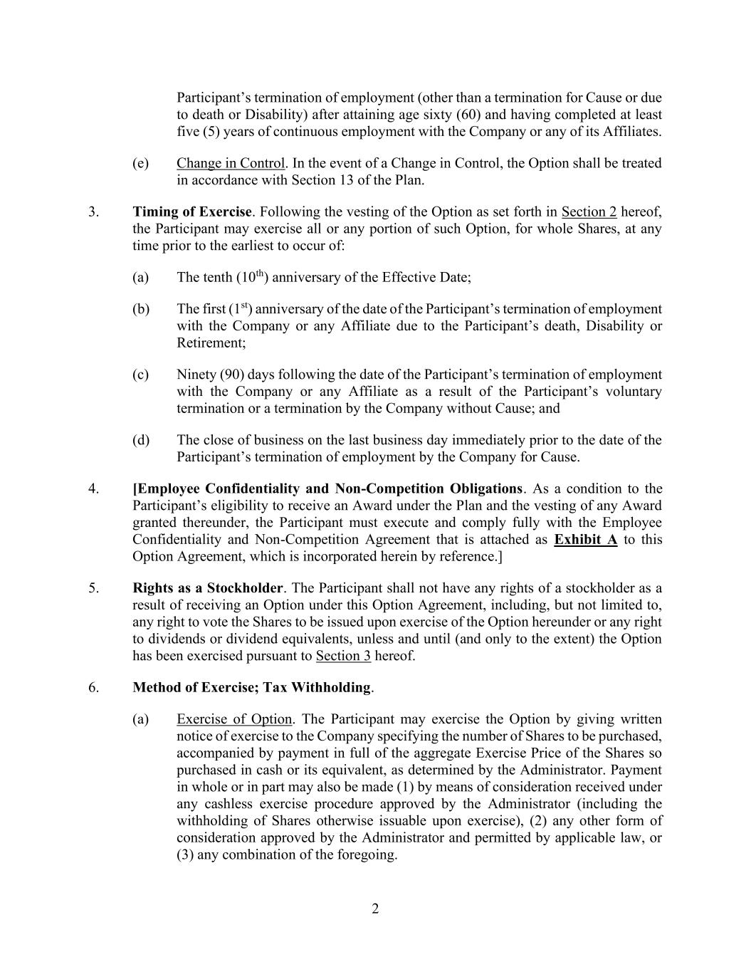 2 Participant’s termination of employment (other than a termination for Cause or due to death or Disability) after attaining age sixty (60) and having completed at least five (5) years of continuous employment with the Company or any of its Affiliates. (e) Change in Control. In the event of a Change in Control, the Option shall be treated in accordance with Section 13 of the Plan. 3. Timing of Exercise. Following the vesting of the Option as set forth in Section 2 hereof, the Participant may exercise all or any portion of such Option, for whole Shares, at any time prior to the earliest to occur of: (a) The tenth (10th) anniversary of the Effective Date; (b) The first (1st) anniversary of the date of the Participant’s termination of employment with the Company or any Affiliate due to the Participant’s death, Disability or Retirement; (c) Ninety (90) days following the date of the Participant’s termination of employment with the Company or any Affiliate as a result of the Participant’s voluntary termination or a termination by the Company without Cause; and (d) The close of business on the last business day immediately prior to the date of the Participant’s termination of employment by the Company for Cause. 4. [Employee Confidentiality and Non-Competition Obligations. As a condition to the Participant’s eligibility to receive an Award under the Plan and the vesting of any Award granted thereunder, the Participant must execute and comply fully with the Employee Confidentiality and Non-Competition Agreement that is attached as Exhibit A to this Option Agreement, which is incorporated herein by reference.] 5. Rights as a Stockholder. The Participant shall not have any rights of a stockholder as a result of receiving an Option under this Option Agreement, including, but not limited to, any right to vote the Shares to be issued upon exercise of the Option hereunder or any right to dividends or dividend equivalents, unless and until (and only to the extent) the Option has been exercised pursuant to Section 3 hereof. 6. Method of Exercise; Tax Withholding. (a) Exercise of Option. The Participant may exercise the Option by giving written notice of exercise to the Company specifying the number of Shares to be purchased, accompanied by payment in full of the aggregate Exercise Price of the Shares so purchased in cash or its equivalent, as determined by the Administrator. Payment in whole or in part may also be made (1) by means of consideration received under any cashless exercise procedure approved by the Administrator (including the withholding of Shares otherwise issuable upon exercise), (2) any other form of consideration approved by the Administrator and permitted by applicable law, or (3) any combination of the foregoing.