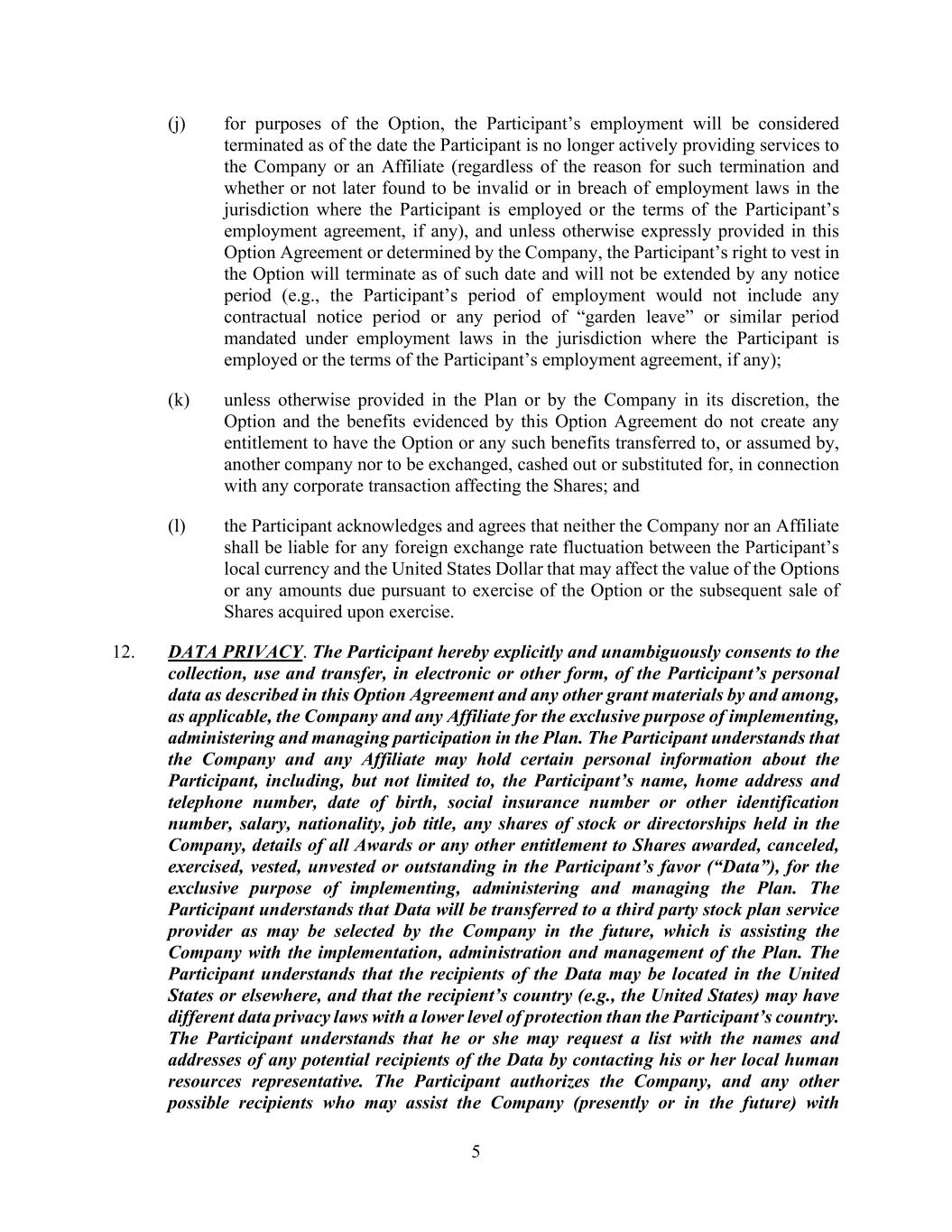 5 (j) for purposes of the Option, the Participant’s employment will be considered terminated as of the date the Participant is no longer actively providing services to the Company or an Affiliate (regardless of the reason for such termination and whether or not later found to be invalid or in breach of employment laws in the jurisdiction where the Participant is employed or the terms of the Participant’s employment agreement, if any), and unless otherwise expressly provided in this Option Agreement or determined by the Company, the Participant’s right to vest in the Option will terminate as of such date and will not be extended by any notice period (e.g., the Participant’s period of employment would not include any contractual notice period or any period of “garden leave” or similar period mandated under employment laws in the jurisdiction where the Participant is employed or the terms of the Participant’s employment agreement, if any); (k) unless otherwise provided in the Plan or by the Company in its discretion, the Option and the benefits evidenced by this Option Agreement do not create any entitlement to have the Option or any such benefits transferred to, or assumed by, another company nor to be exchanged, cashed out or substituted for, in connection with any corporate transaction affecting the Shares; and (l) the Participant acknowledges and agrees that neither the Company nor an Affiliate shall be liable for any foreign exchange rate fluctuation between the Participant’s local currency and the United States Dollar that may affect the value of the Options or any amounts due pursuant to exercise of the Option or the subsequent sale of Shares acquired upon exercise. 12. DATA PRIVACY. The Participant hereby explicitly and unambiguously consents to the collection, use and transfer, in electronic or other form, of the Participant’s personal data as described in this Option Agreement and any other grant materials by and among, as applicable, the Company and any Affiliate for the exclusive purpose of implementing, administering and managing participation in the Plan. The Participant understands that the Company and any Affiliate may hold certain personal information about the Participant, including, but not limited to, the Participant’s name, home address and telephone number, date of birth, social insurance number or other identification number, salary, nationality, job title, any shares of stock or directorships held in the Company, details of all Awards or any other entitlement to Shares awarded, canceled, exercised, vested, unvested or outstanding in the Participant’s favor (“Data”), for the exclusive purpose of implementing, administering and managing the Plan. The Participant understands that Data will be transferred to a third party stock plan service provider as may be selected by the Company in the future, which is assisting the Company with the implementation, administration and management of the Plan. The Participant understands that the recipients of the Data may be located in the United States or elsewhere, and that the recipient’s country (e.g., the United States) may have different data privacy laws with a lower level of protection than the Participant’s country. The Participant understands that he or she may request a list with the names and addresses of any potential recipients of the Data by contacting his or her local human resources representative. The Participant authorizes the Company, and any other possible recipients who may assist the Company (presently or in the future) with